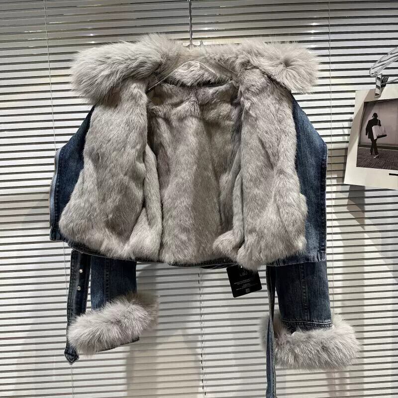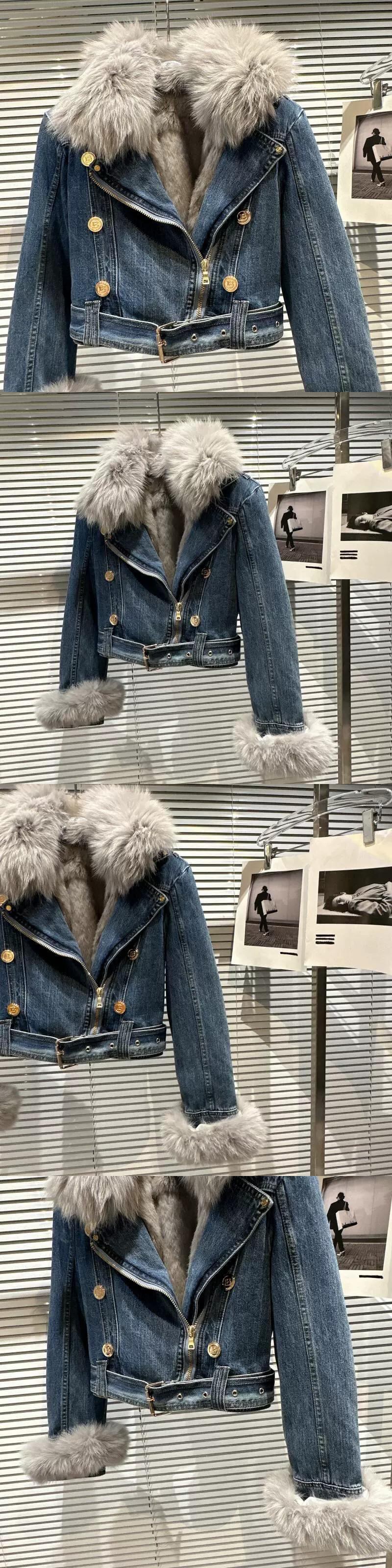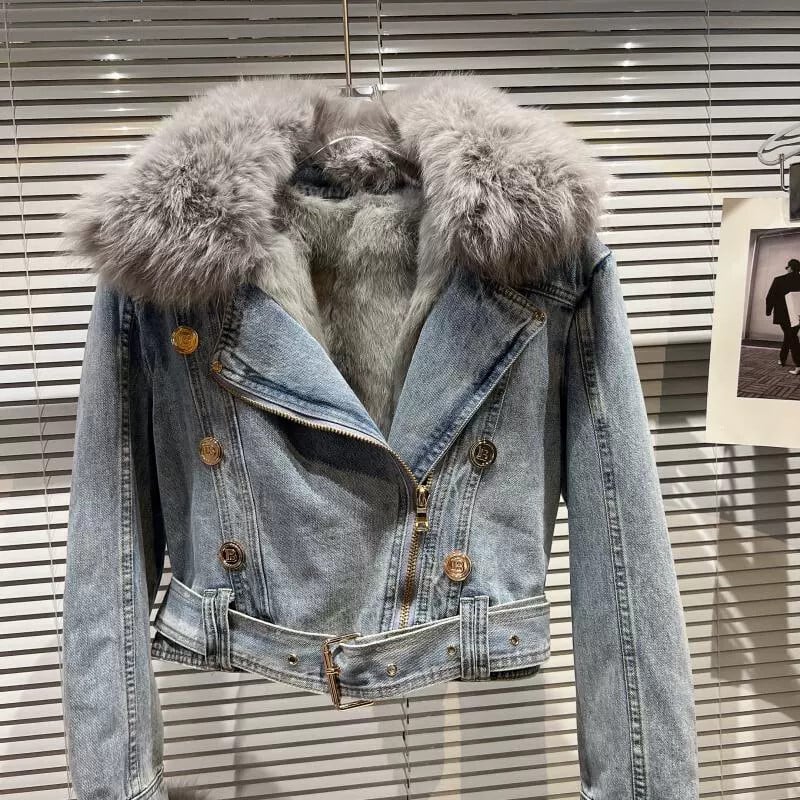ネット有名人の同じスタイル 2024 春の新ストリートキツネの毛皮の襟ウサギの毛皮の裏地金属バックル暖かいデニムショートジャケット スプリング 春物 gyan3394464048495 | vestitialla
