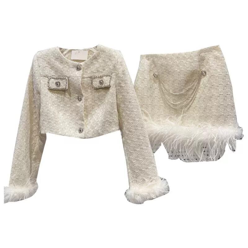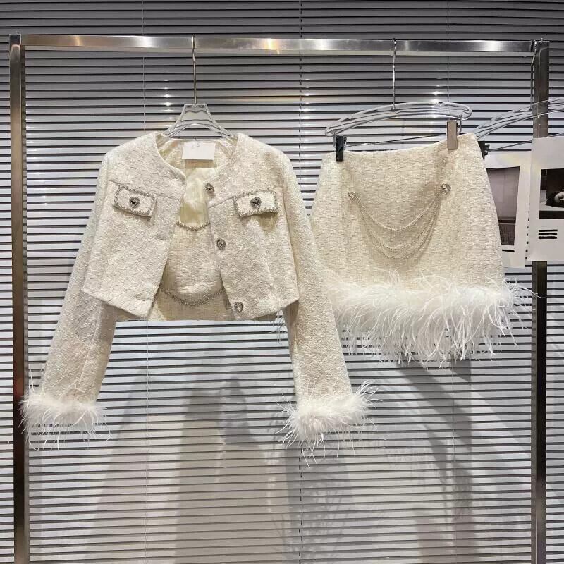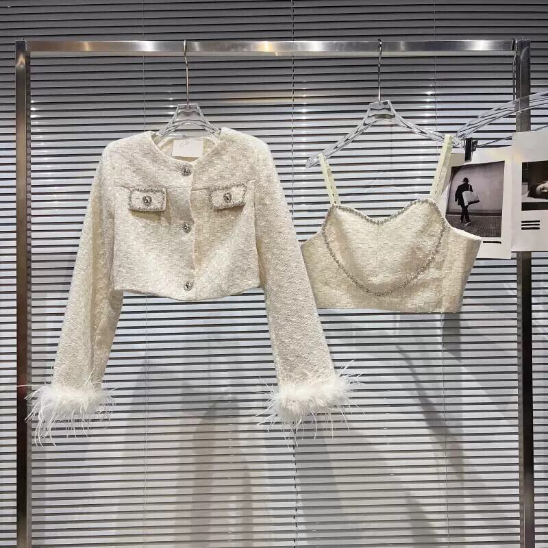 ネット有名人同風2024春新風小香るダチョウの羽ラブダイヤモンドサスペンダー+ショートジャケット+ショートスカート3点セット スプリング 春物 gyan3362652994293 | vestitialla