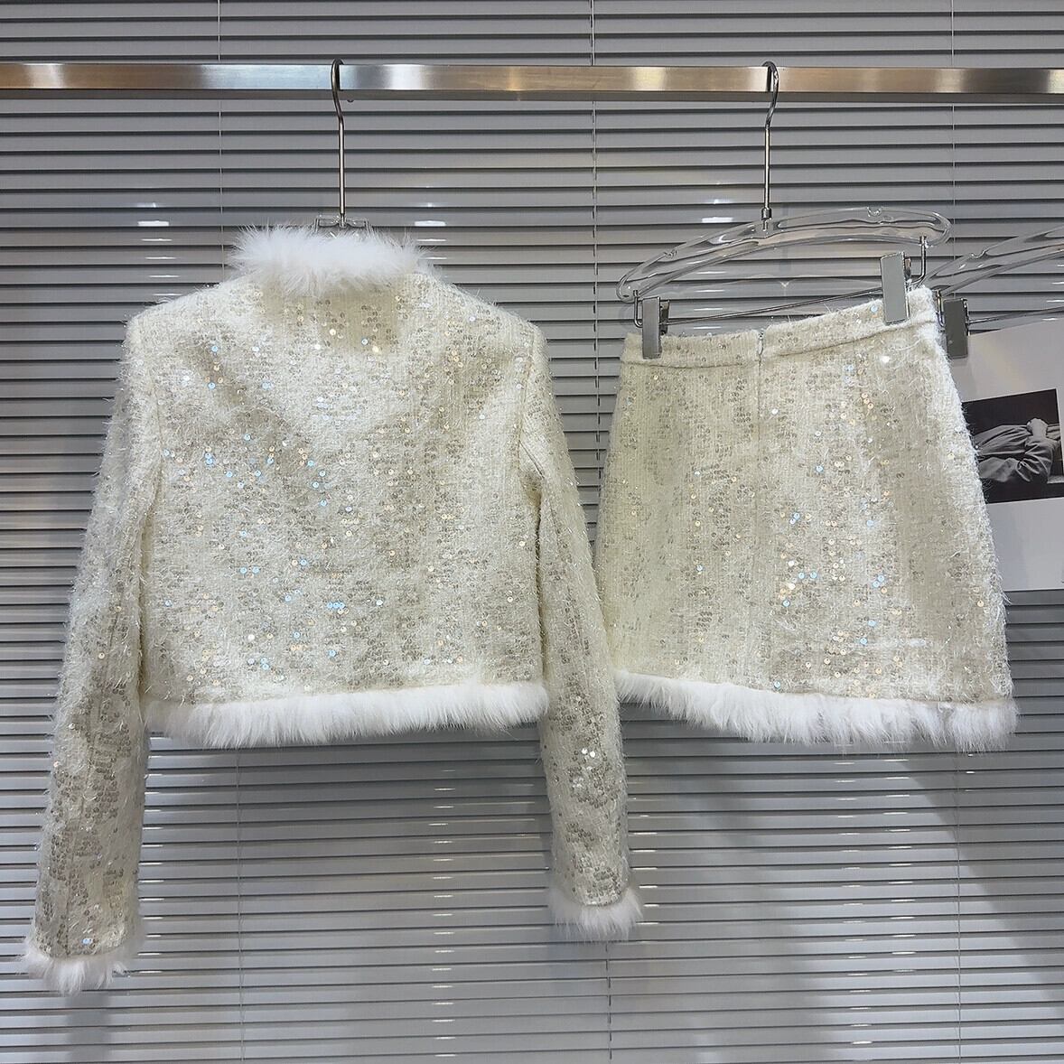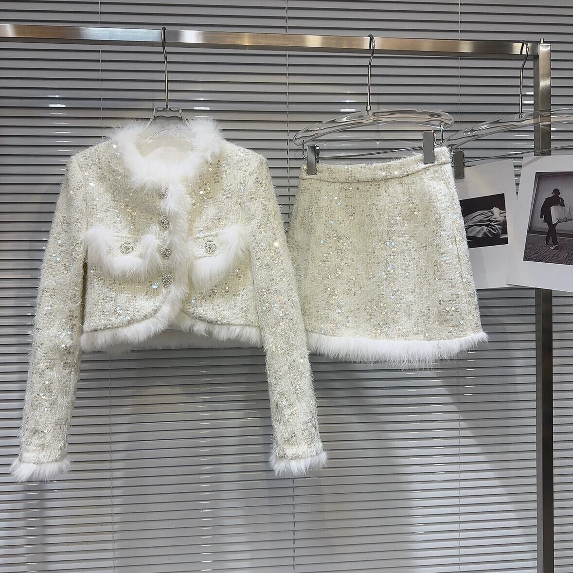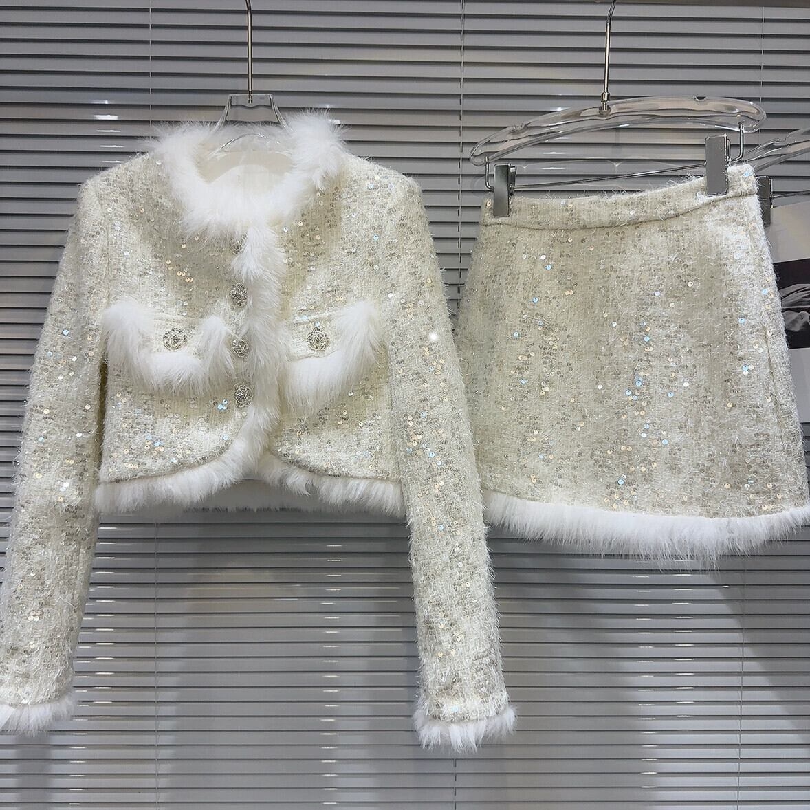 インターネット有名人の同じスタイル2024新しい冬スタイルフォックスファーエッジスパンコールツイードジャケット+ショートスカートキルティングスーツ ウィンター 冬物 gyan3330526155555 | vestitialla