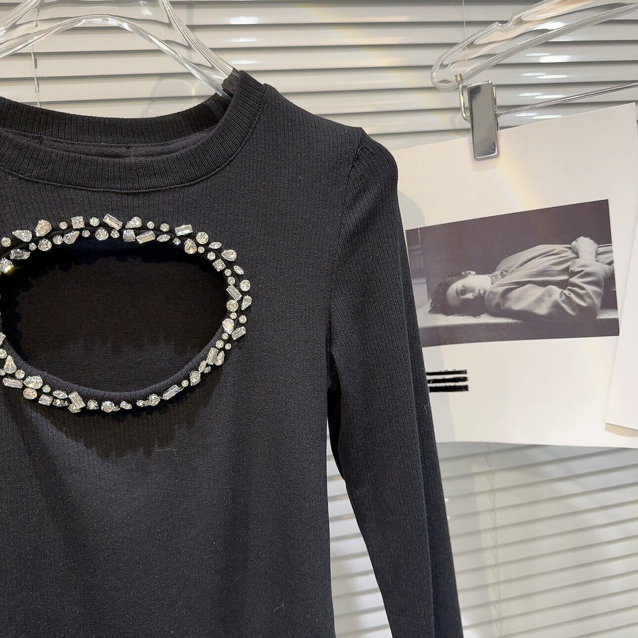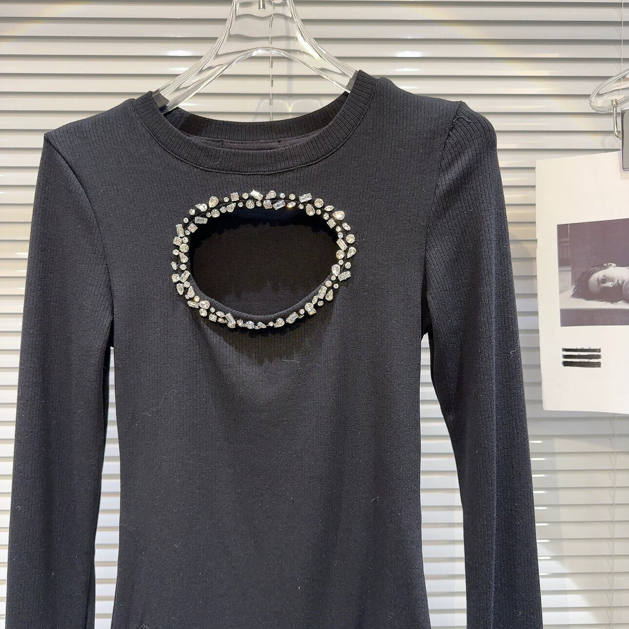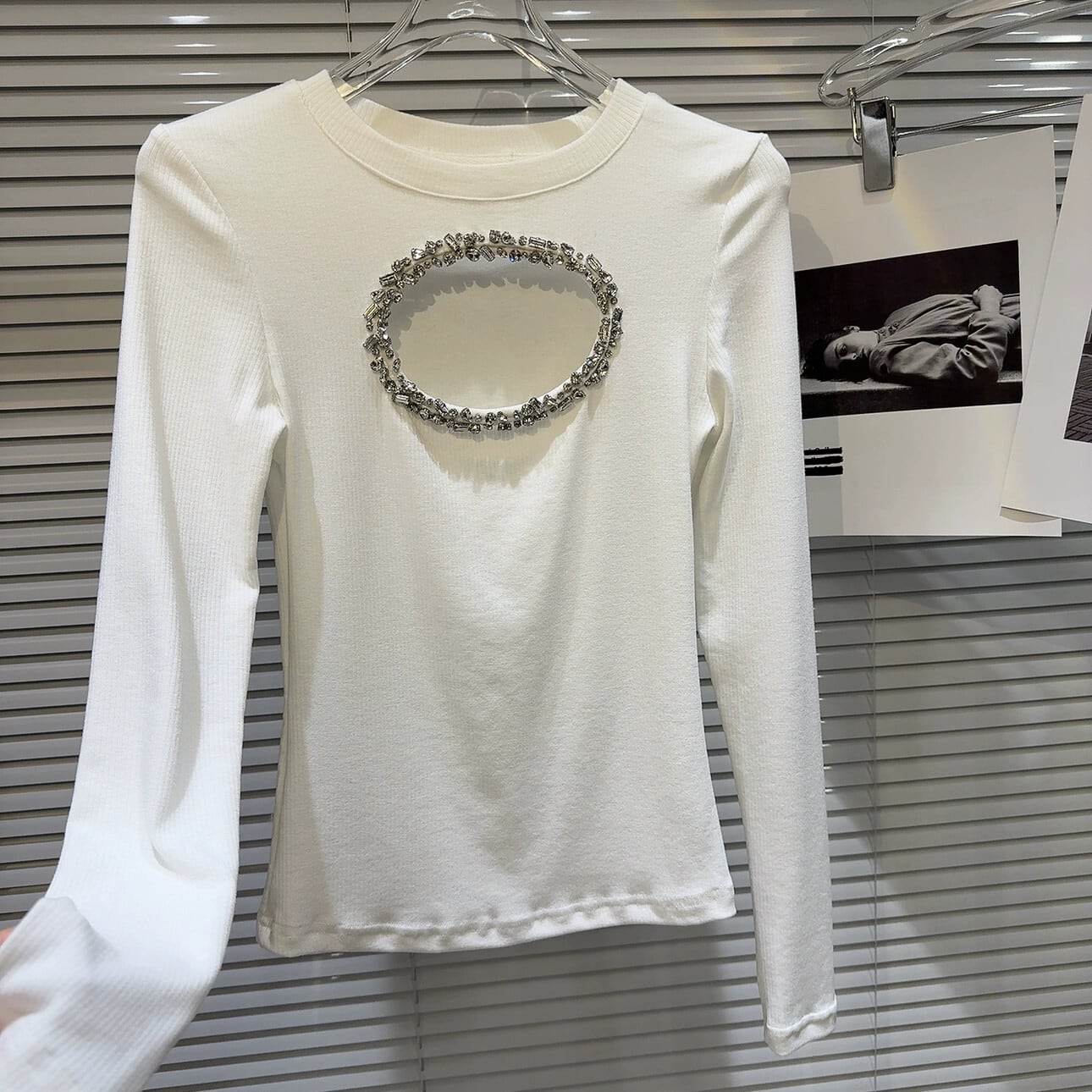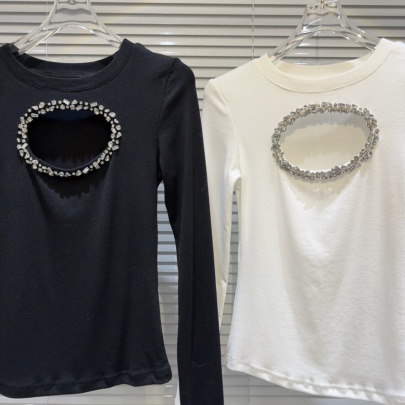 インターネット有名人の同じ2024春の新しいスタイルの胸にサークルダイヤモンドビーズの中空デザインが施されたダーク長袖Tシャツ ロング スプリング 春物 gyan3385177850546 | vestitialla