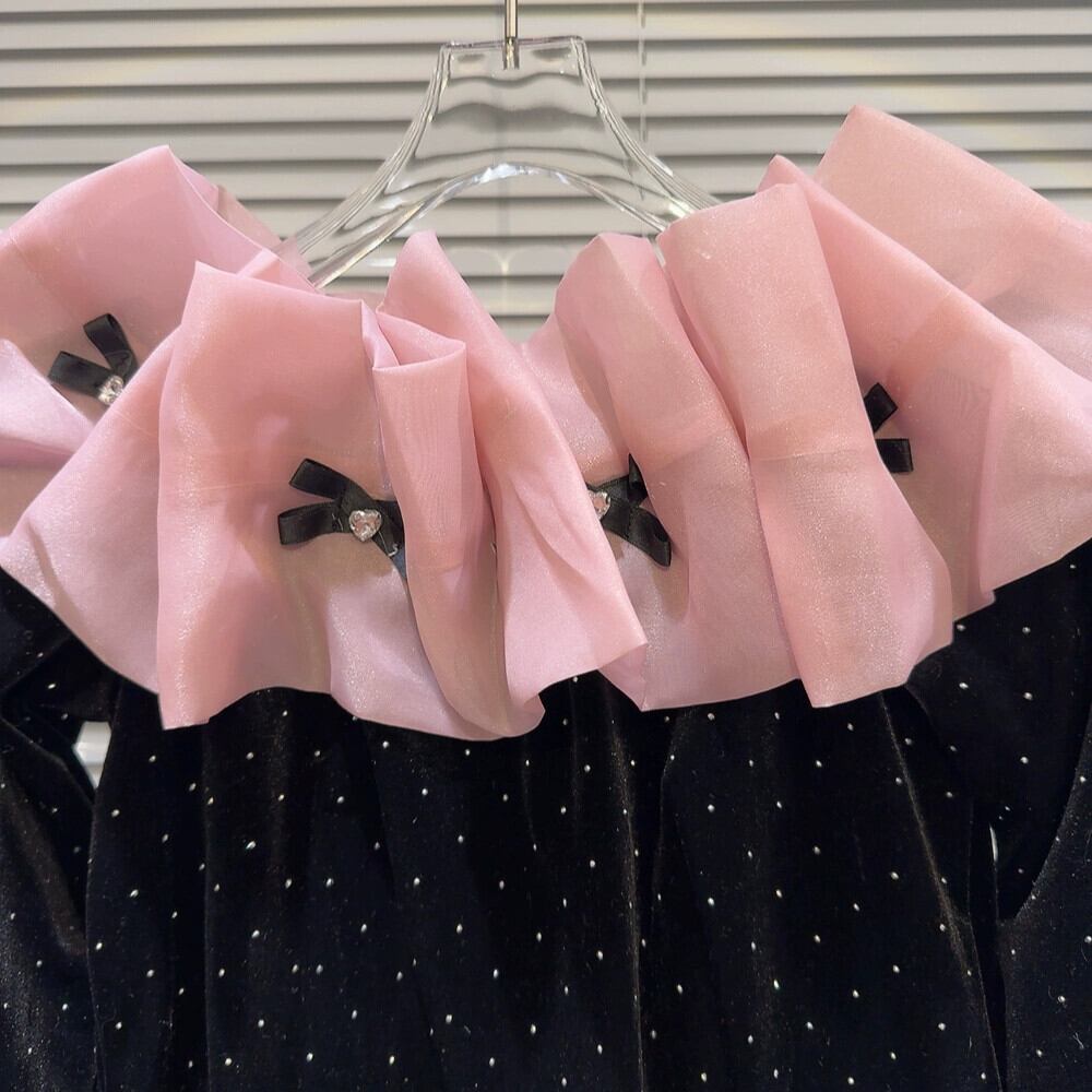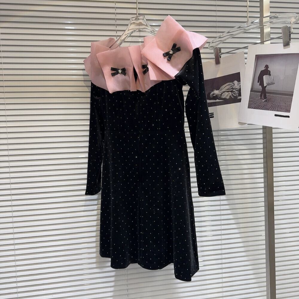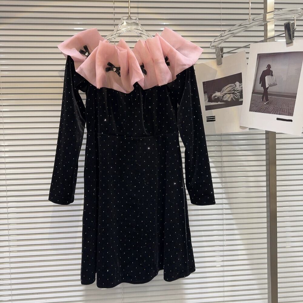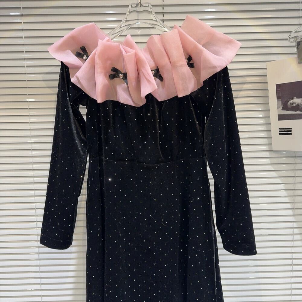 インターネットセレブの同じスタイル2024新しい冬スタイルダークセレブメッシュプリーツカラースタースタッズベルベットドレス ウィンター 冬物 gyan3392858491231 | vestitialla