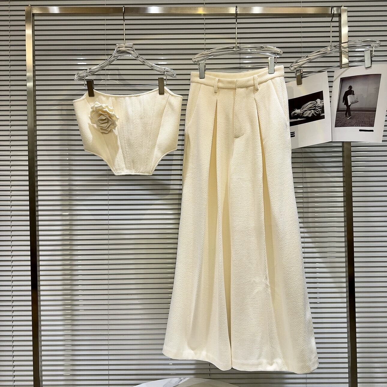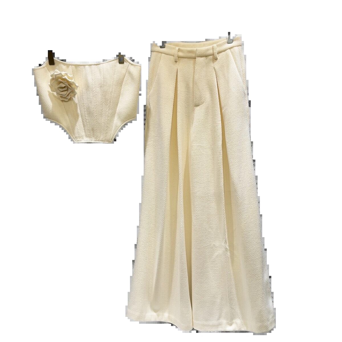 ネット有名人の同じスタイル2024冬の新しいスタイルの小さな香りフラワーピンフィッシュボーンチューブトップ+ウールワイドレッグパンツスーツ女性 ウィンター 冬物 フラワーデザイン gyan3333509940831 | vestitialla