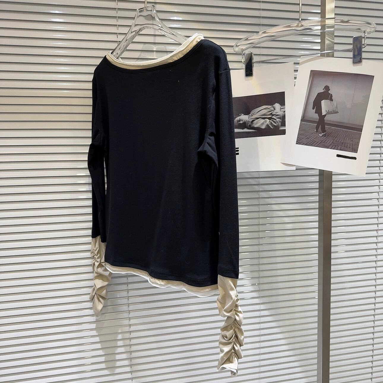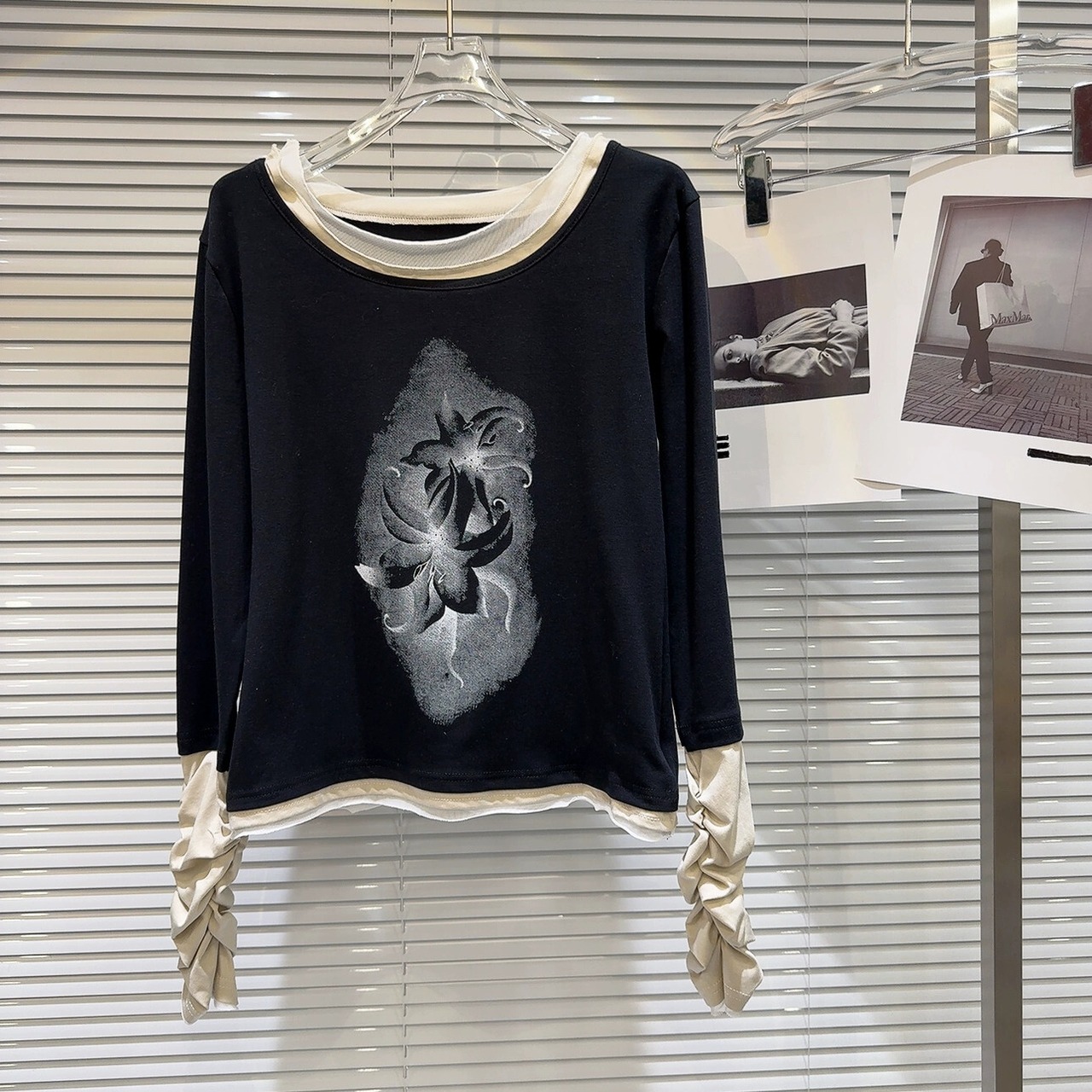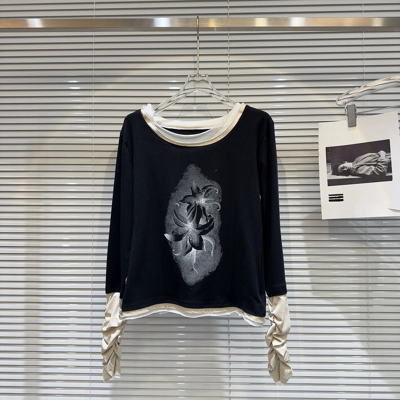 インターネットセレブと同じスタイル 2024 春の新ニッチレトロプリントパターンプリーツパッチワークスリーブ長袖 Tシャツ女性 ロング スプリング 春物 gyan3327436389961 | vestitialla
