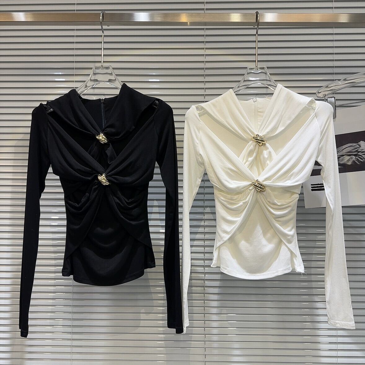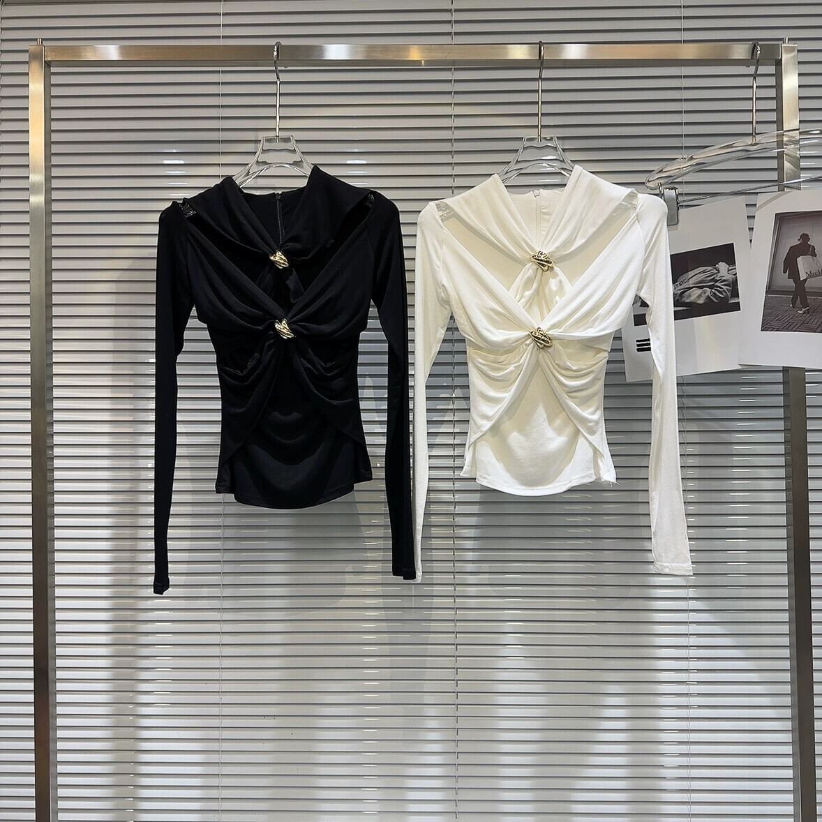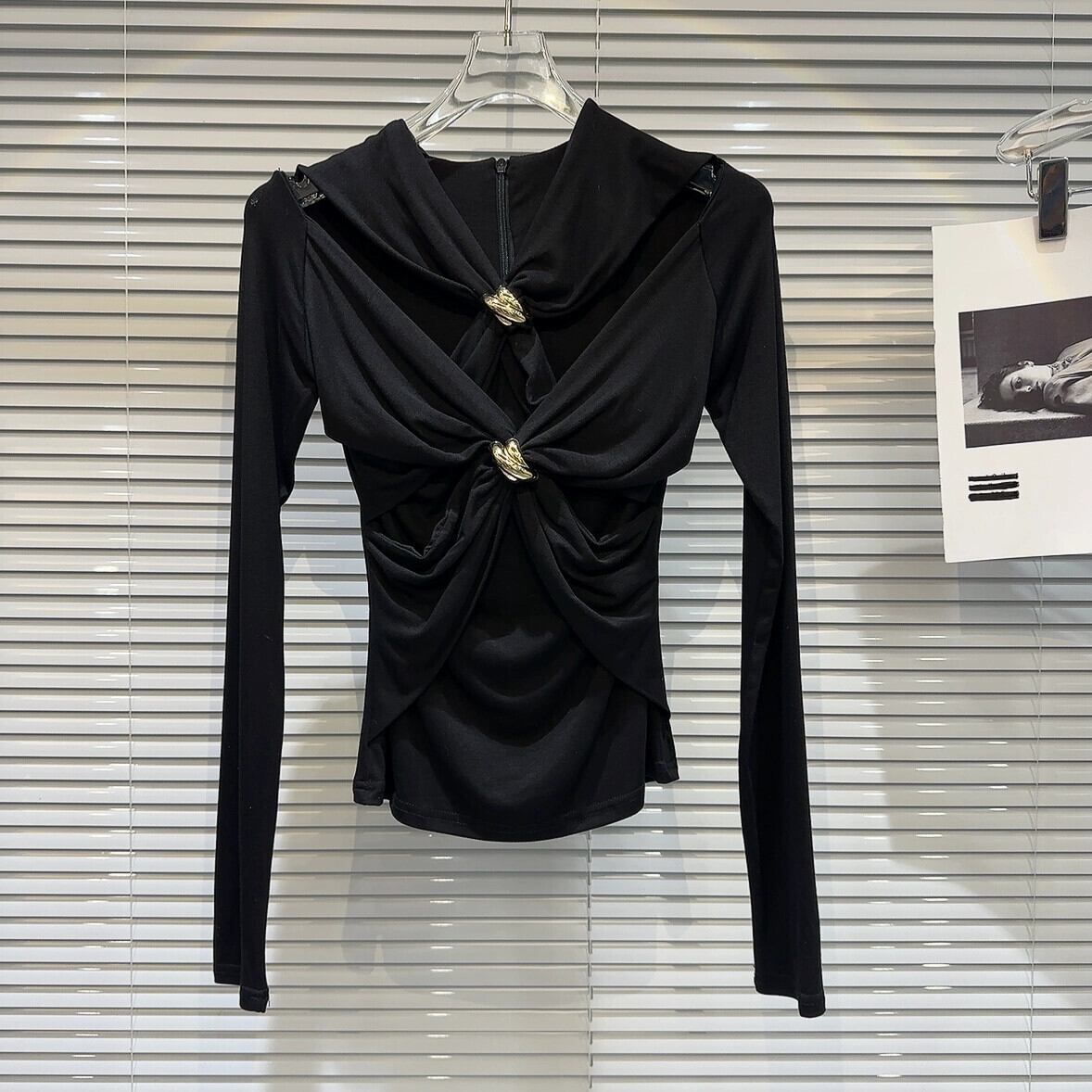 インターネットセレブと同じスタイル 2024 春の新セクシーな社交界のメタルバックルクロスデザインダーク長袖 Tシャツ ロング スプリング 春物 gyan3365634189872 | vestitialla