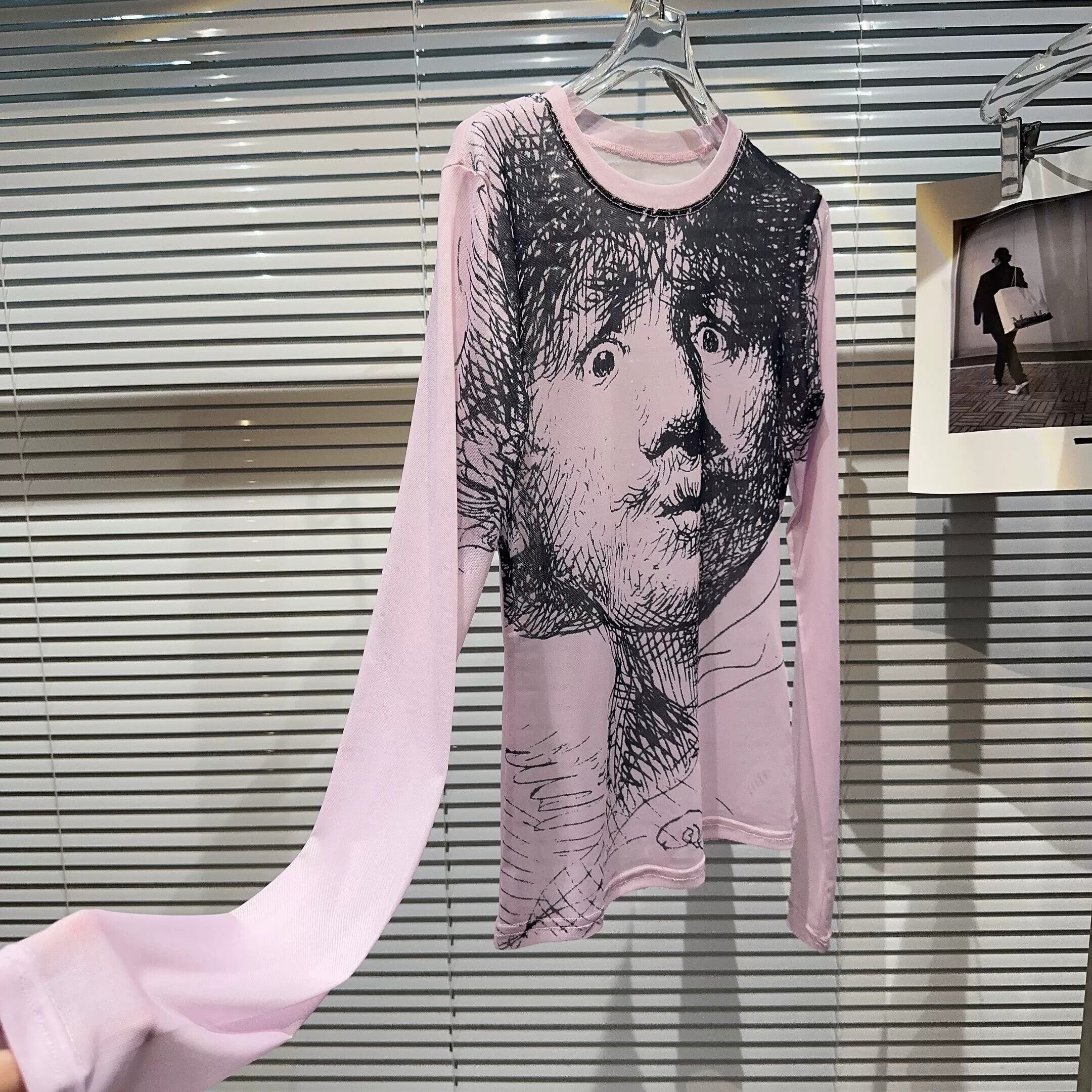 ネット有名人の2024年春の新スタイル、大きな目と手描きのキャラクターが描かれたぴったりとした微透明メッシュボトムTシャツ スプリング 春物 gyan3357380263953 | vestitialla