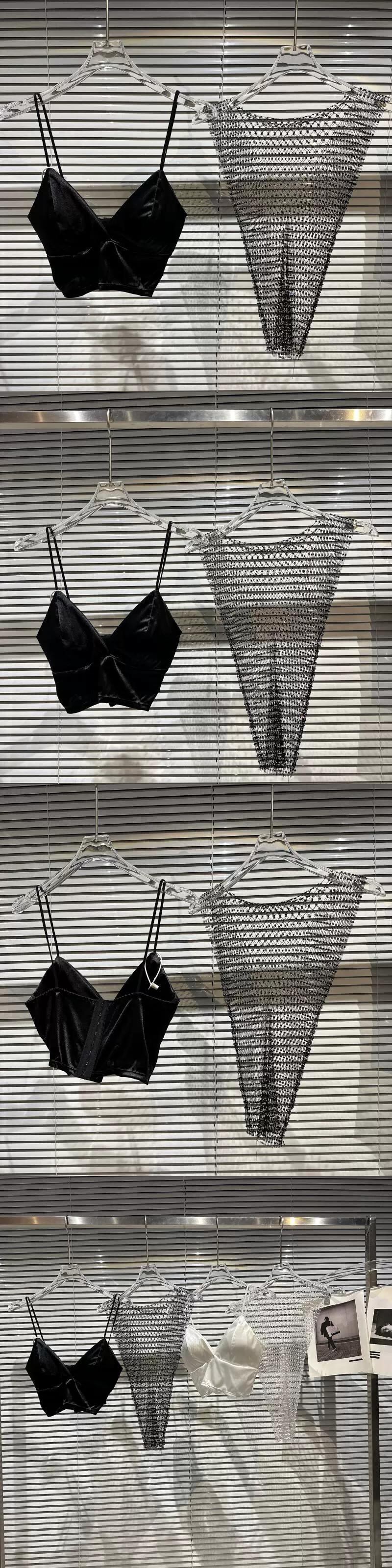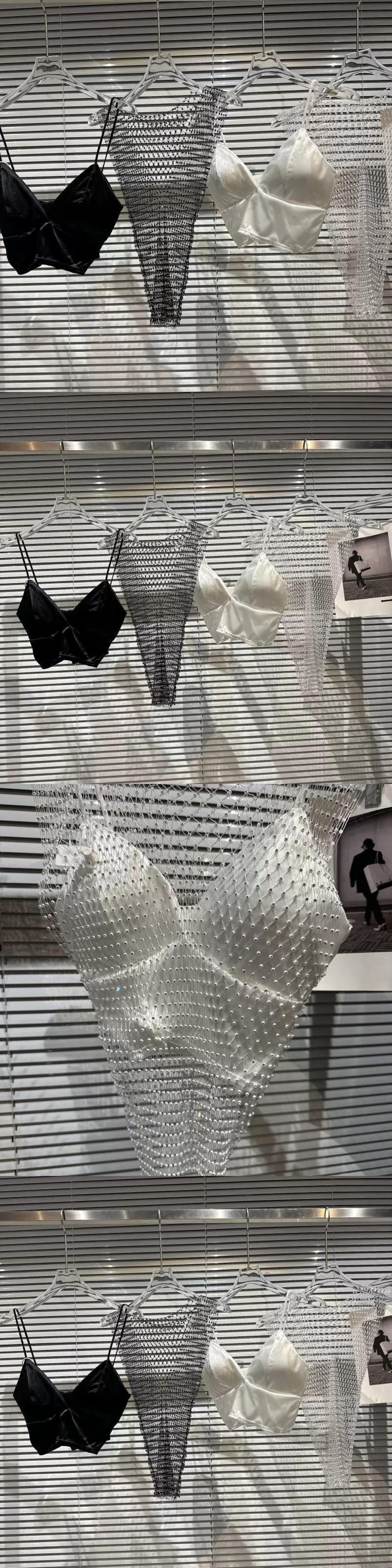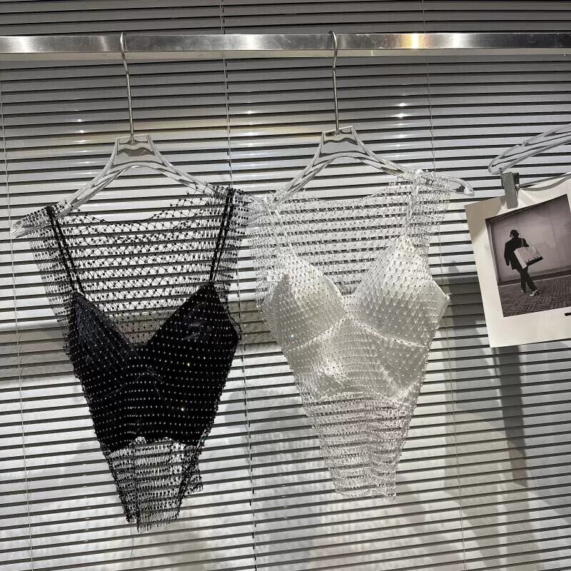 ネットセレブ同様 2024 春新スタイルセクシー社交家メッシュグリッドラインストーンアウター裏地重工業ベストサスペンダー 2 点セット スプリング 春物 gyan3384686823101 | vestitialla