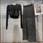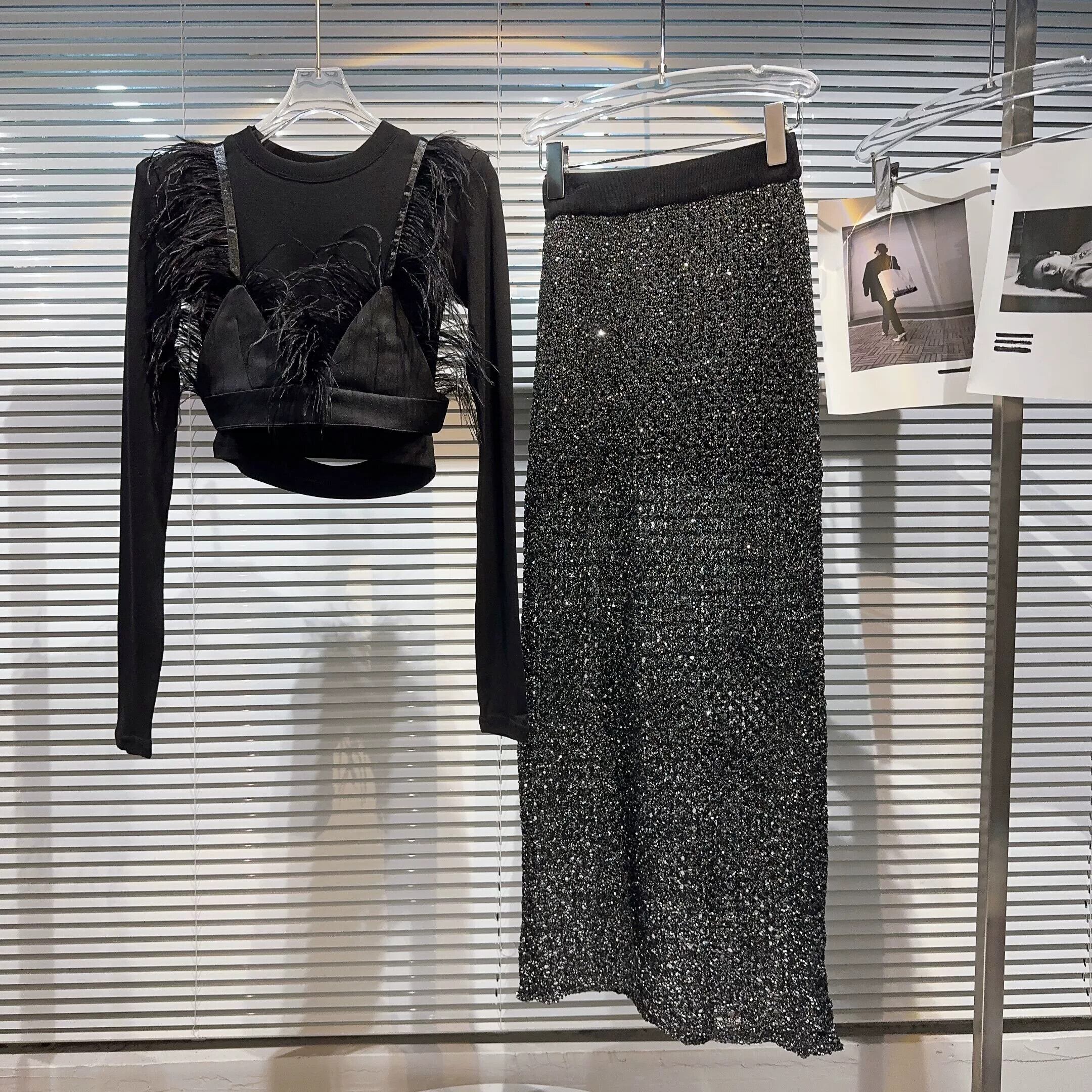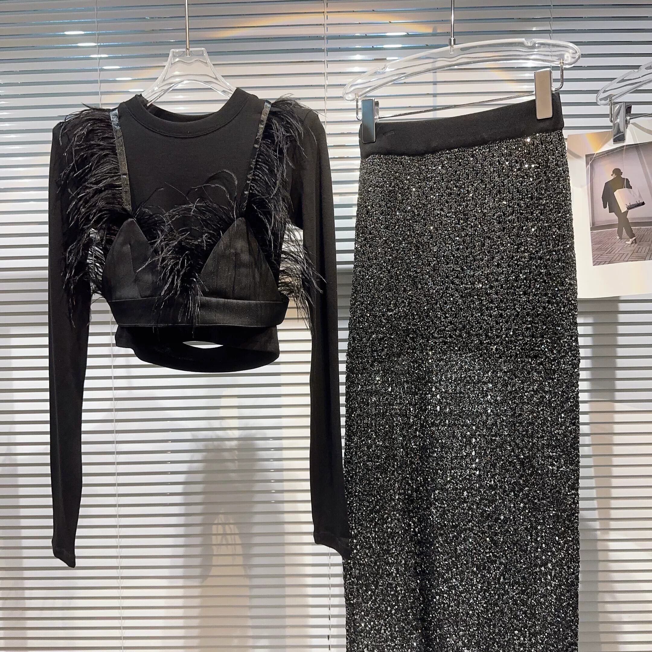 ネット有名人の同じスタイル 2024 春の新スタイルの小さな香りのよいダチョウエッジサスペンダー T シャツ + わずかに半透明のシルクロングスカートスーツの女性 スプリング 春物 Tシャツ gyan3373550529205 | vestitialla