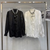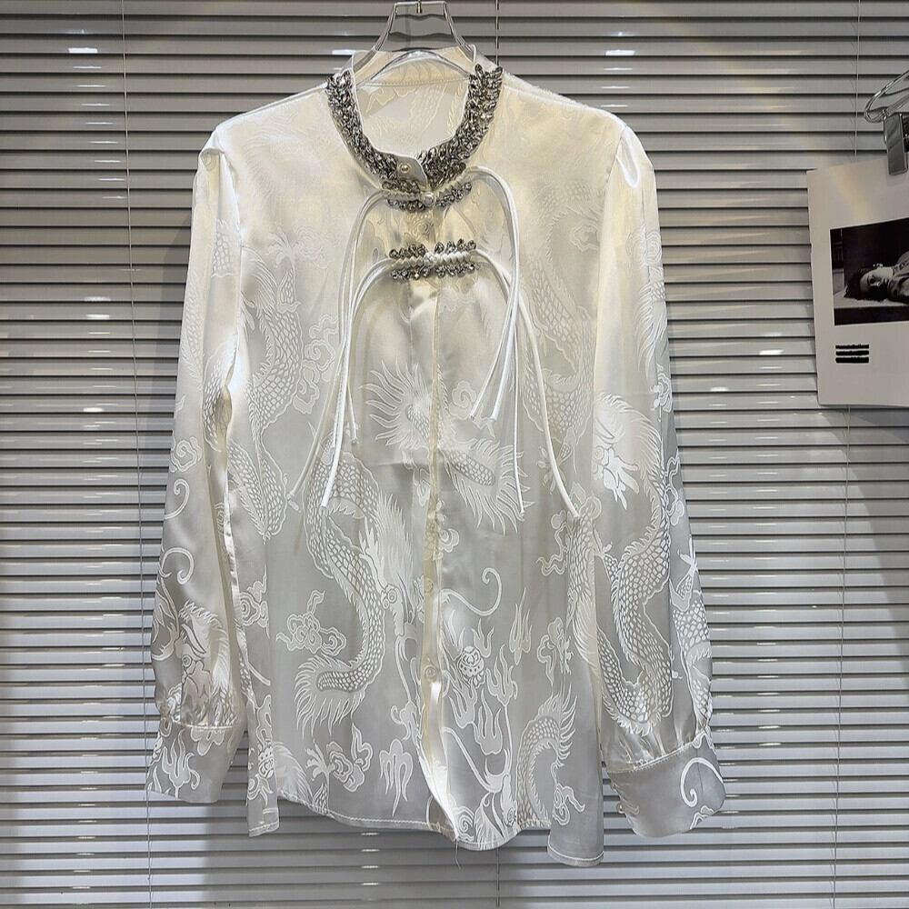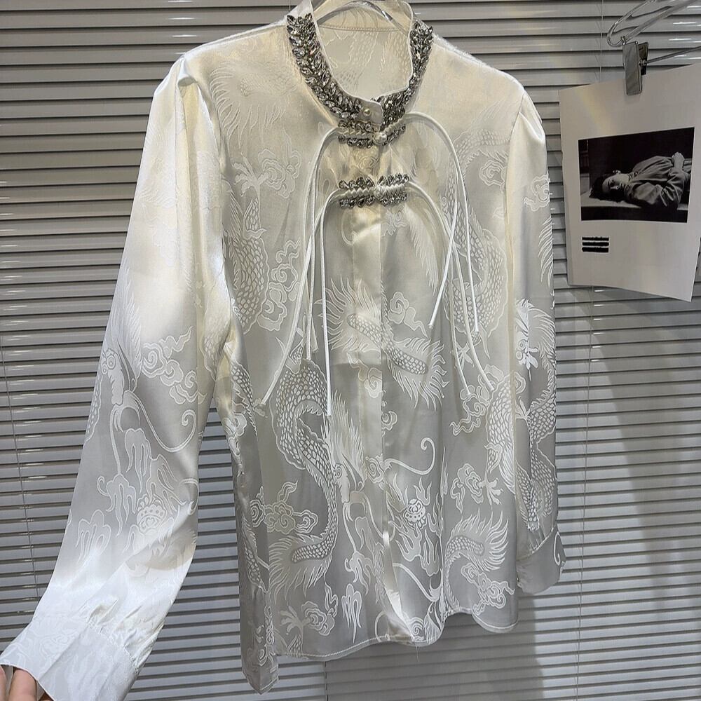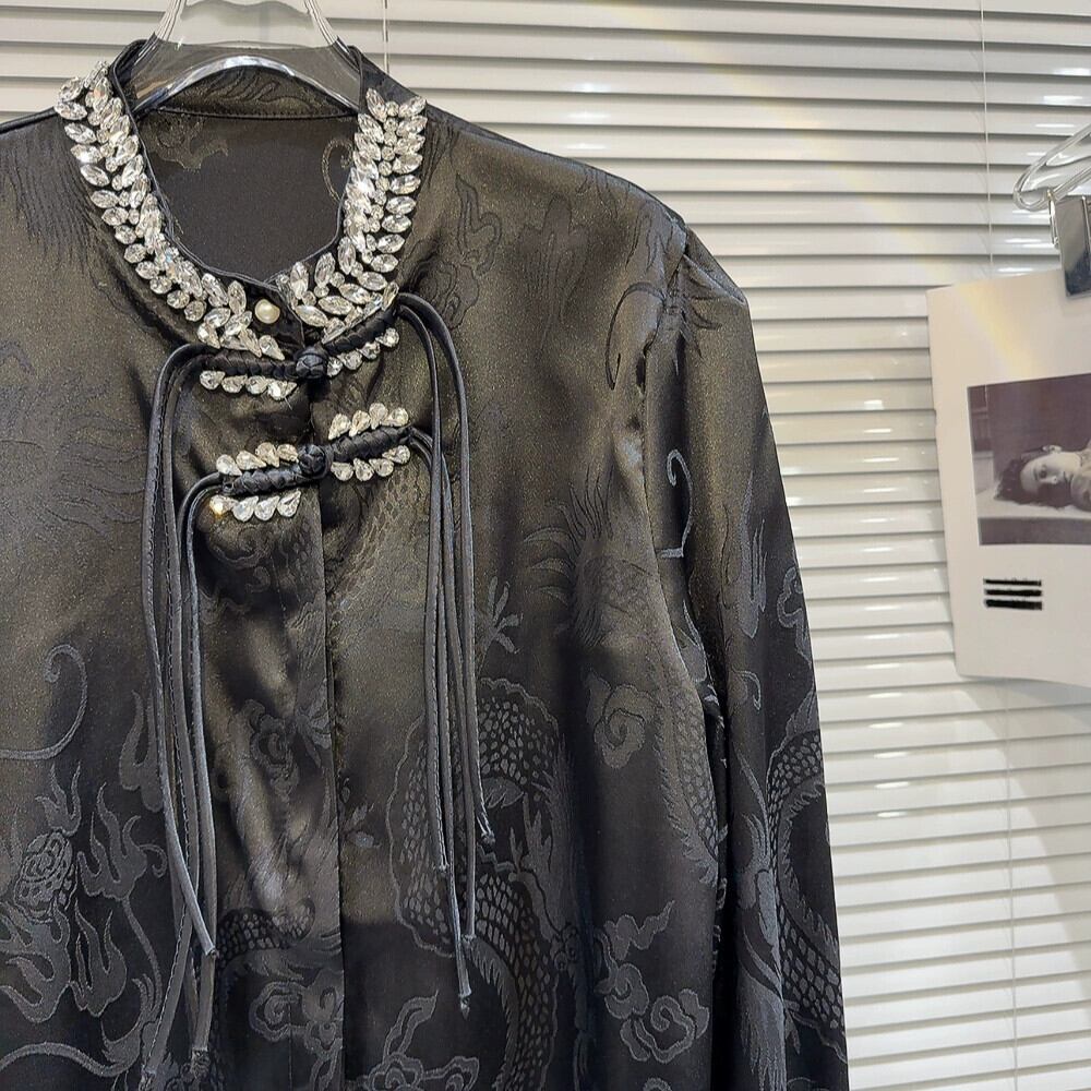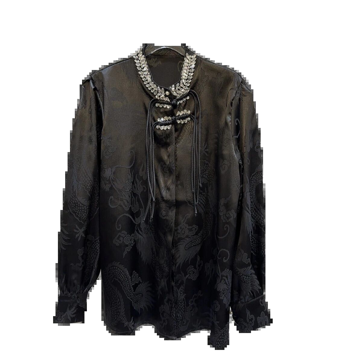インターネット有名人の同じスタイル 2024 春の新レトロディスクバックルラインストーンビーズスタンドアップカラーデザインダークフラワーサテンシャツシャツ スプリング 春物 フラワーデザイン gyan3392965081899 | vestitialla