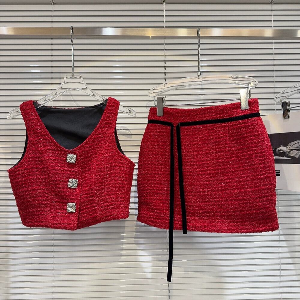 インターネットセレブの同じスタイル2024春の新しいスタイルの小さな香りのセレブの高精細ラインストーンボタンツイードベスト+ショートスカートスーツ スプリング 春物 gyan3324273619639 | vestitialla