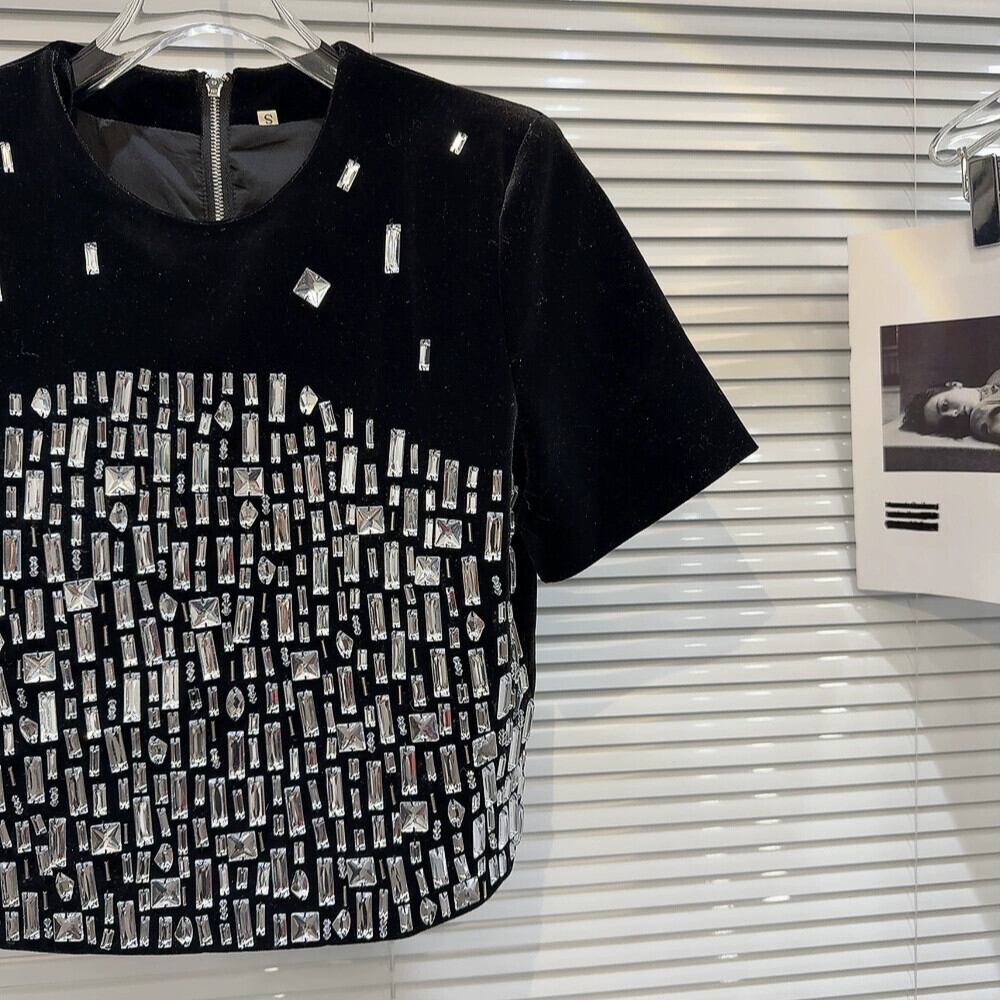 インターネットセレブと同じスタイル 2024 春の新重工業手作り宝石ラインストーンビーズベルベット半袖 Tシャツ半袖女性 スプリング 春物 gyan3334296682555 | vestitialla