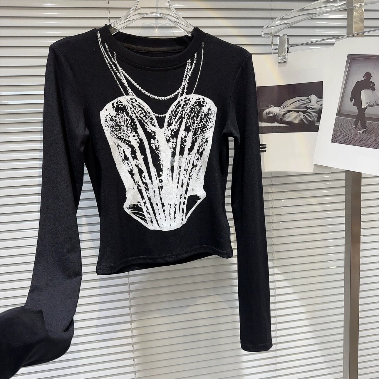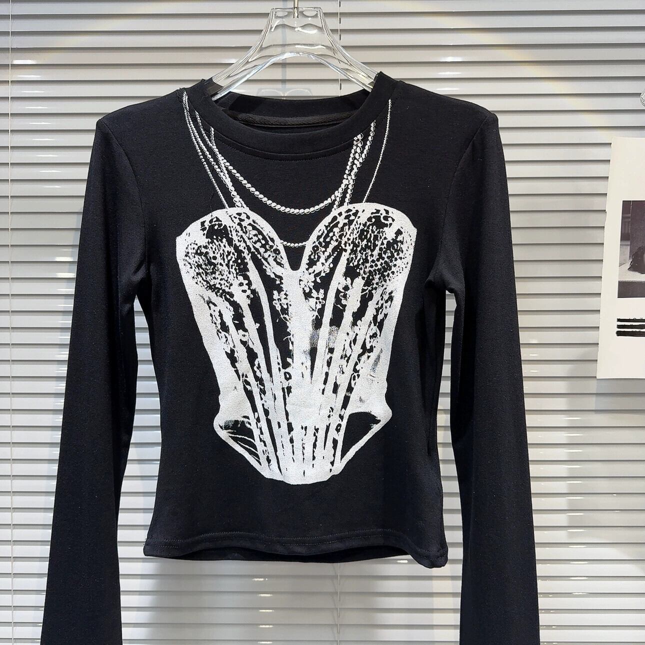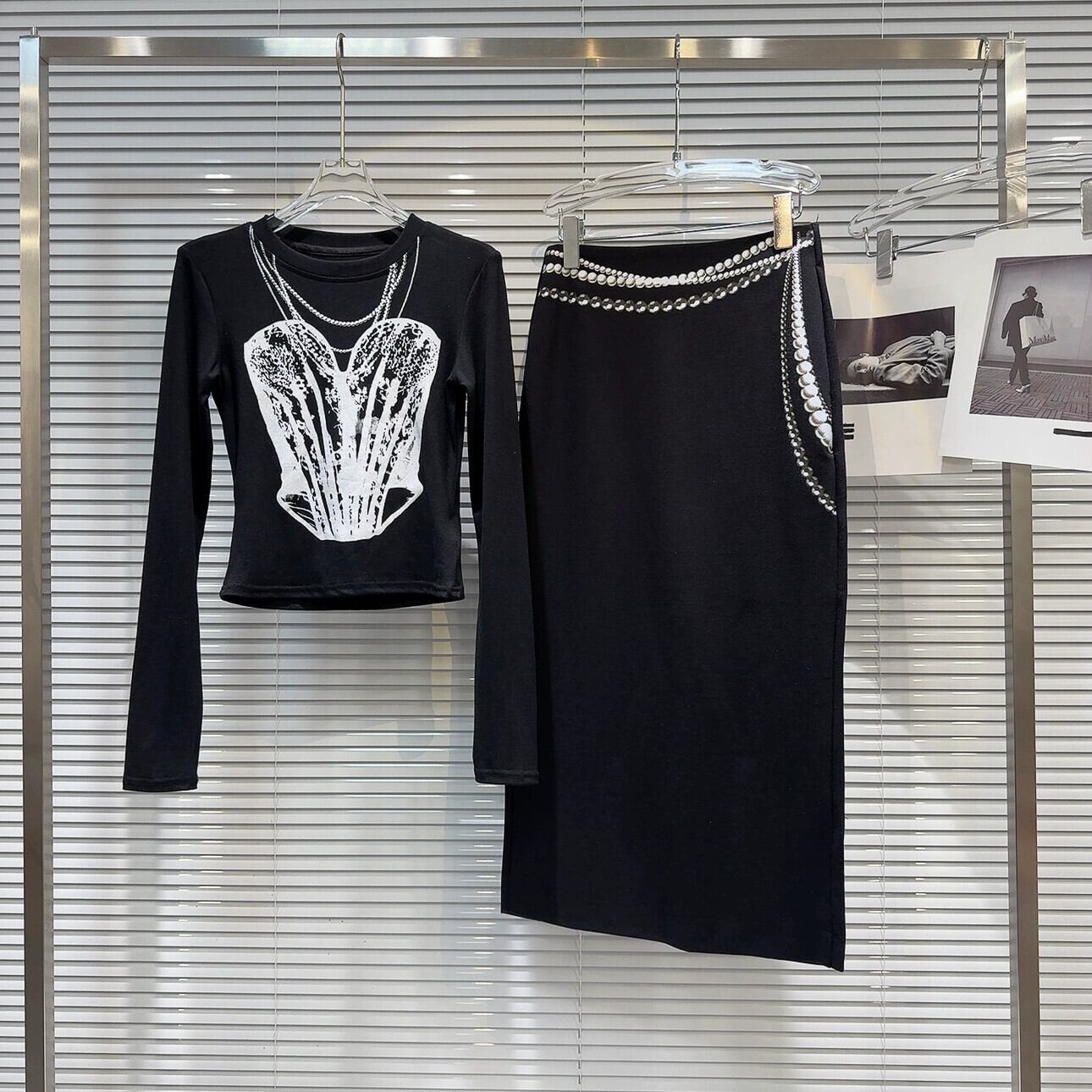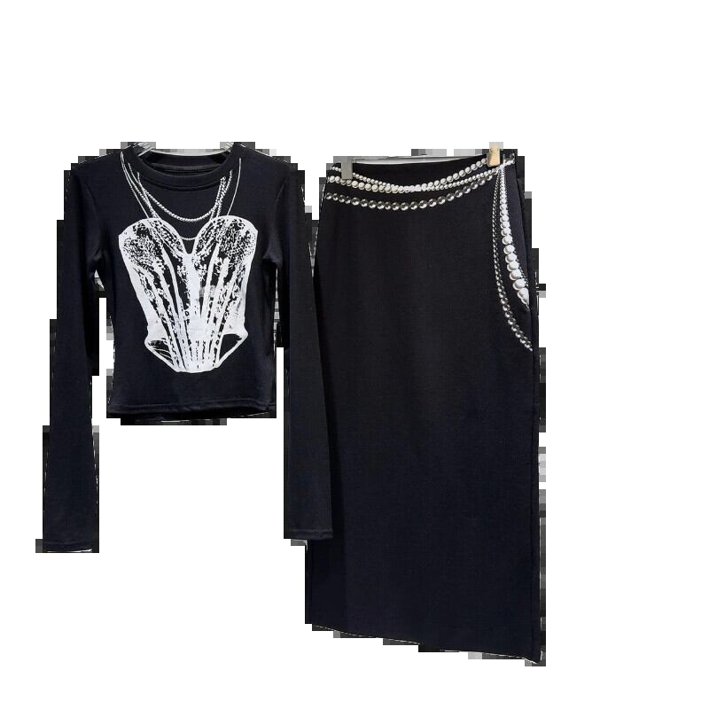ネットセレブと同じスタイルの2024春の新作ニッチパールプリント長袖Tシャツ+ミッドレングスヒップスカートスーツ女性 ロング スプリング 春物 真珠 gyan3373049351840 | vestitialla