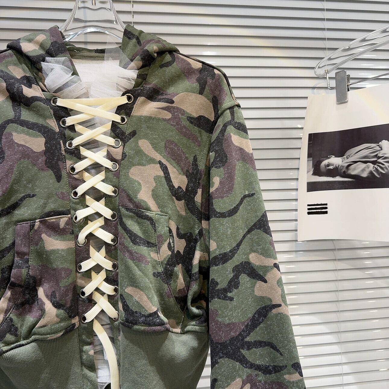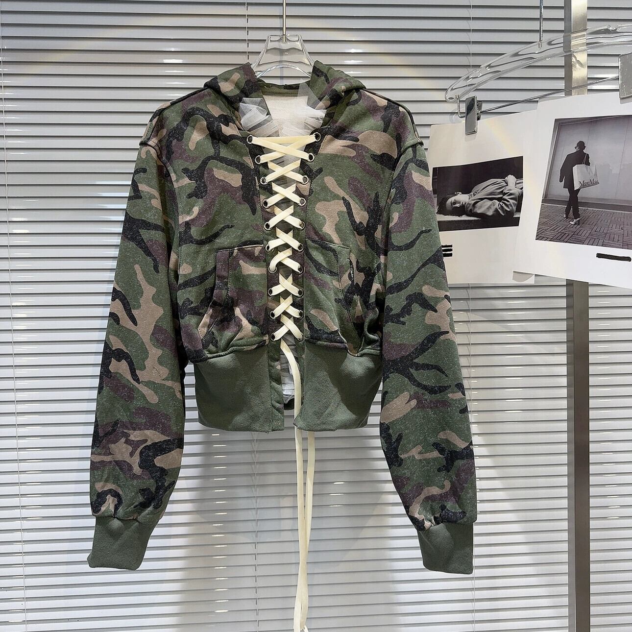 インターネットセレブと同じスタイル 2024 春の新ニッチ巾着ストラップグリーン迷彩揚げ花柄フード付きスウェットシャツパーカー スプリング 春物 フラワーデザイン gyan3375540667708 | vestitialla
