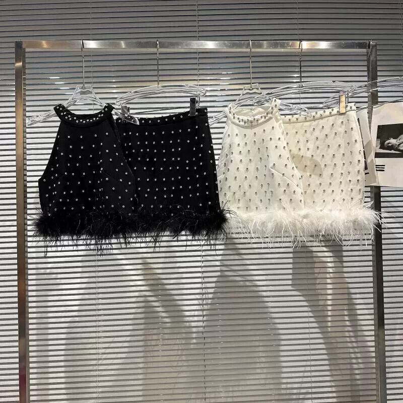 インターネットセレブの同じスタイル2024春小さな香り風水ダイヤモンドビーズフェザーローエッジホルターネックストラップ+ヒップカバーショートスカートスーツ スプリング 春物 gyan3310059998885 | vestitialla