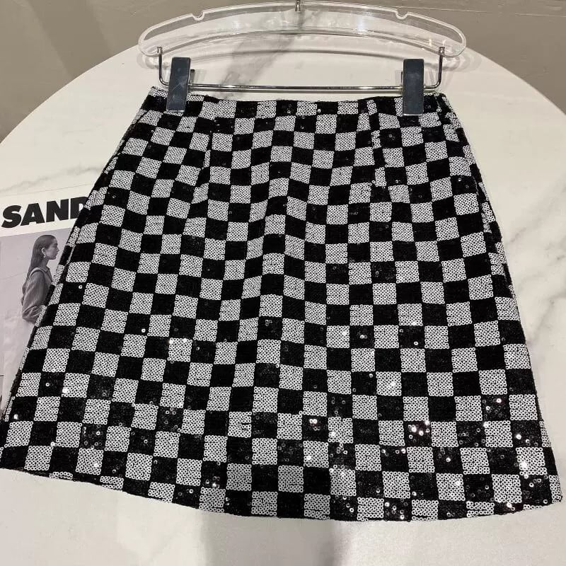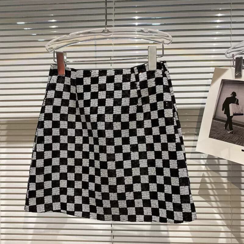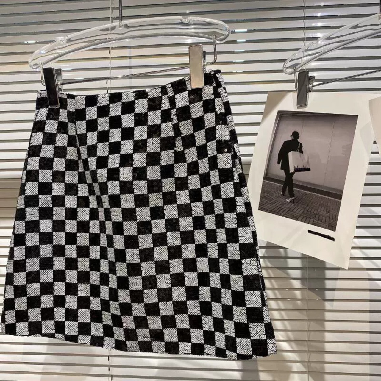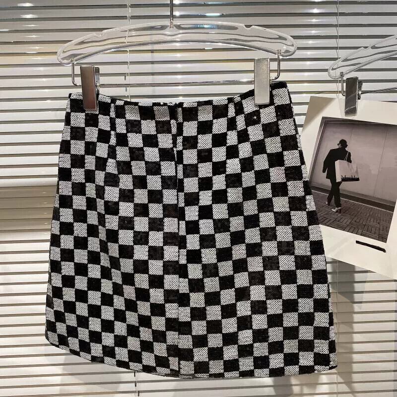 インターネット有名人の同じスタイル2024春の新しいニッチモデル黒と白のチェスとカードチェック重工業スパンコール光沢のあるヒップカバースカート女性 ホワイト ブラック スプリング 春物 gyan3396113138178 | vestitialla