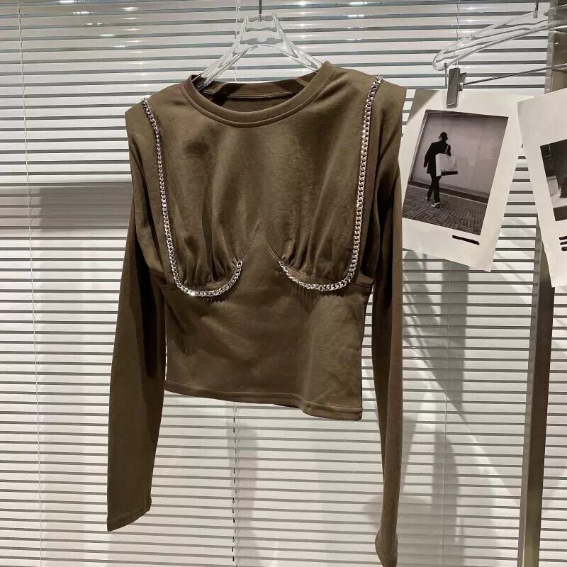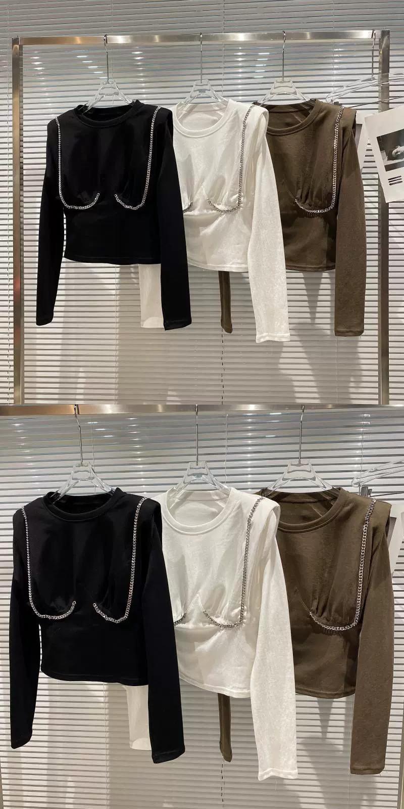 インターネットセレブと同じスタイルの2024春の新作メタルチェーンプリーツラグランスリーブ肩パッド付き底綿Tシャツ コットン スプリング 春物 gyan3312076360859 | vestitialla