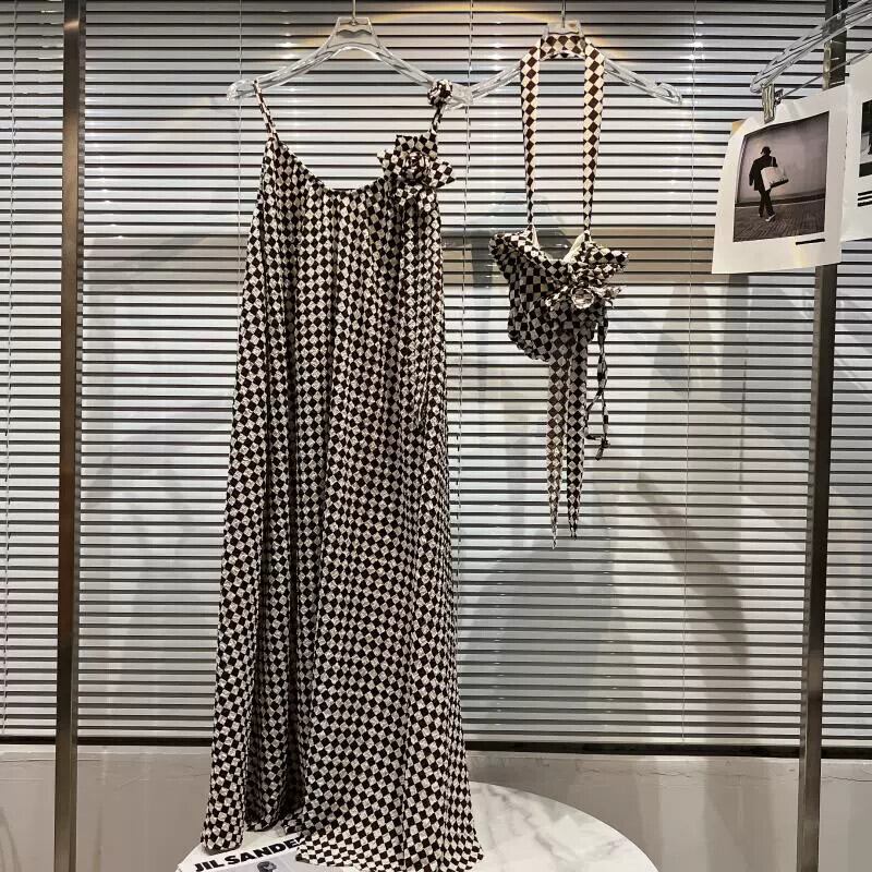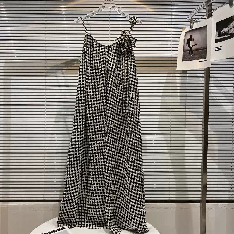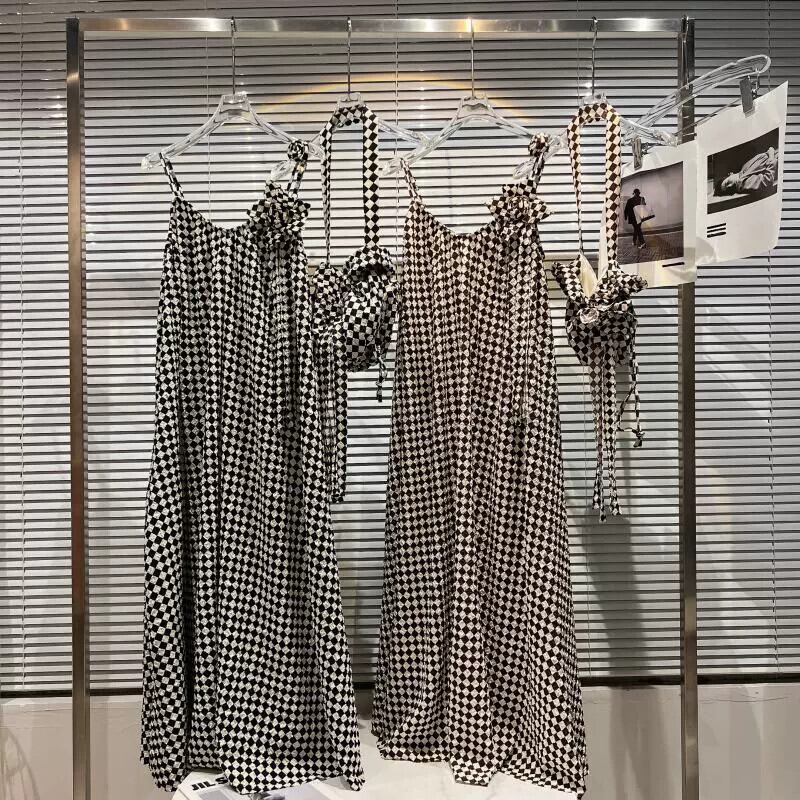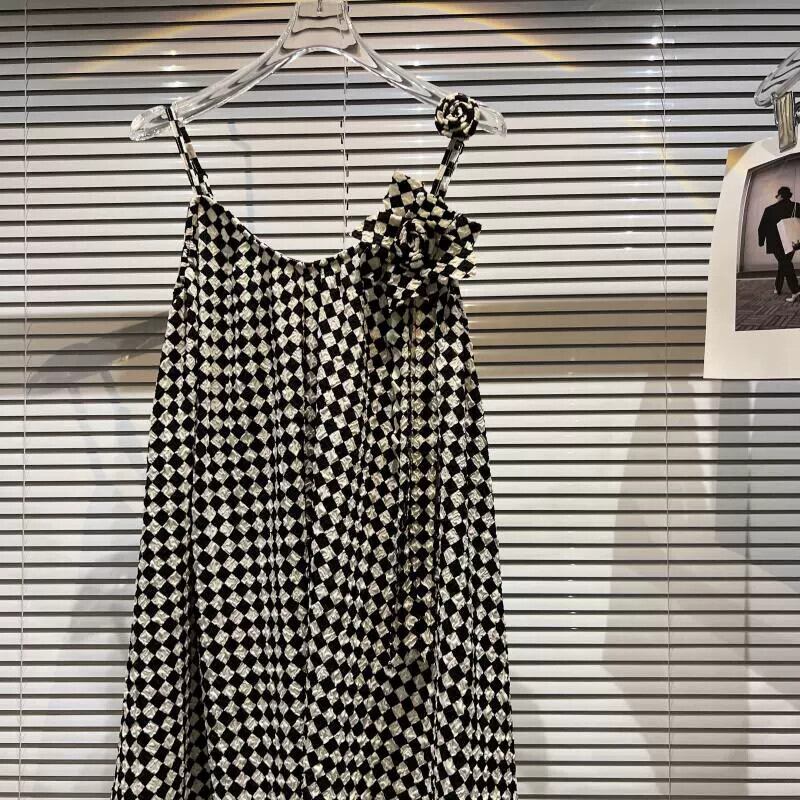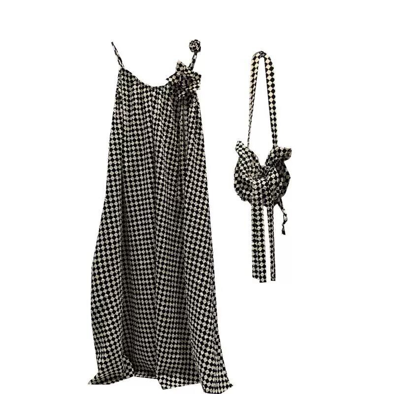 インターネット有名人同じスタイル 2024 新しい夏のスタイル小さな香り黒と白の千鳥格子フラワーバッグ装飾サスペンダードレス女性 ホワイト ブラック サマー 夏物 フラワーデザイン gyan3343052916723 | vestitialla