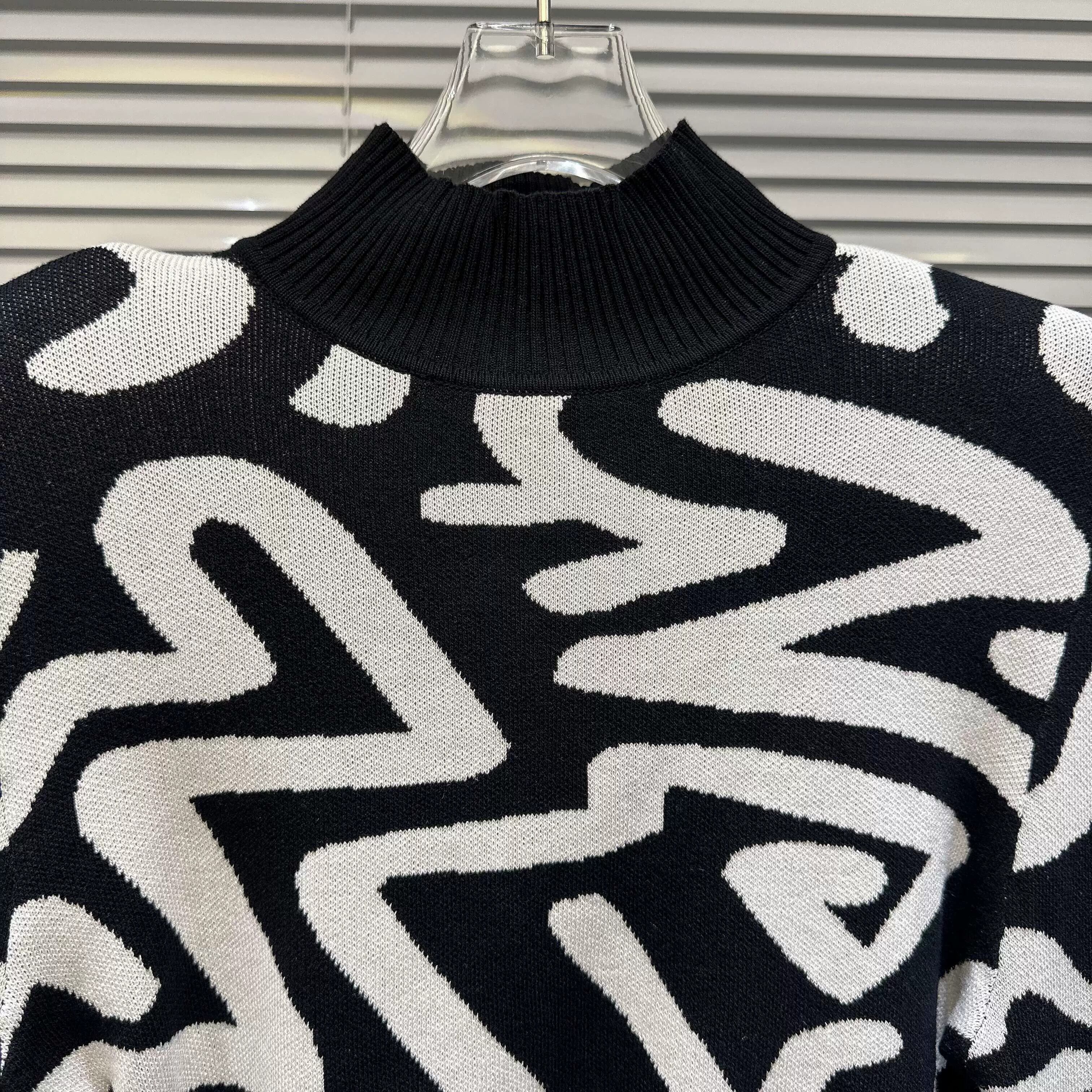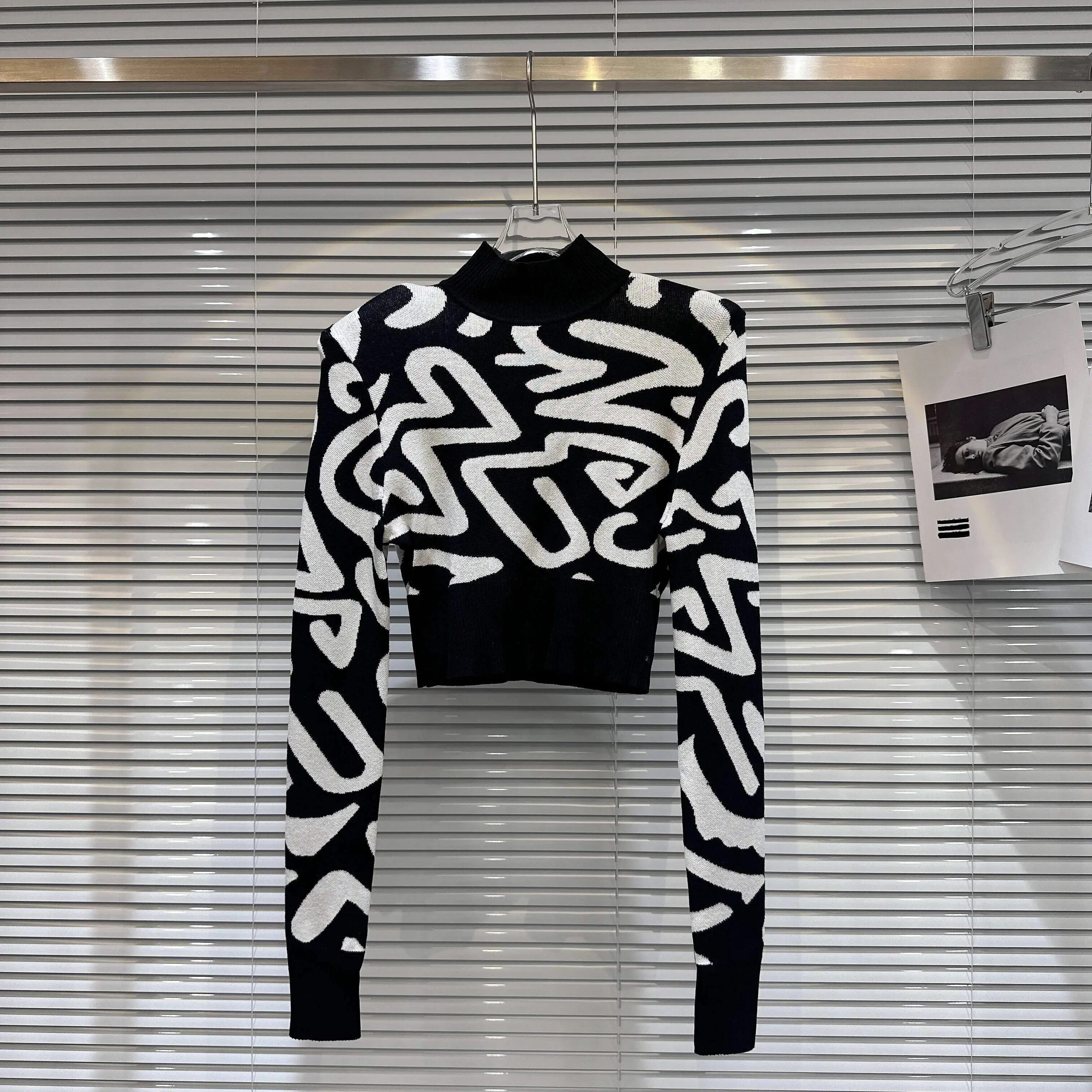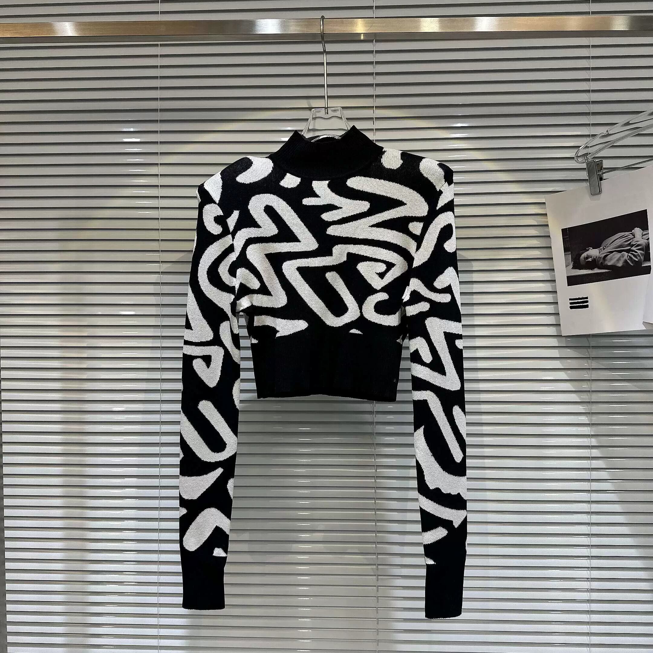インターネット有名人の同じスタイル2024春の新しいニッチスタイル黒と白の対照的な不規則なパターンのプルオーバータートルネックニットセーター ホワイト ブラック スプリング 春物 gyan3356602495560 | vestitialla