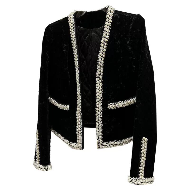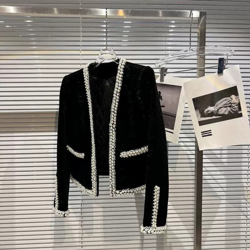 ネット有名人の同じスタイル 2024 春の新スタイル小さな香りのスタイルパールネイルビーズエッジゴールドベルベットインナーキルティングトップショートコート女性 スプリング 春物 真珠 gyan3375730846559 | vestitialla