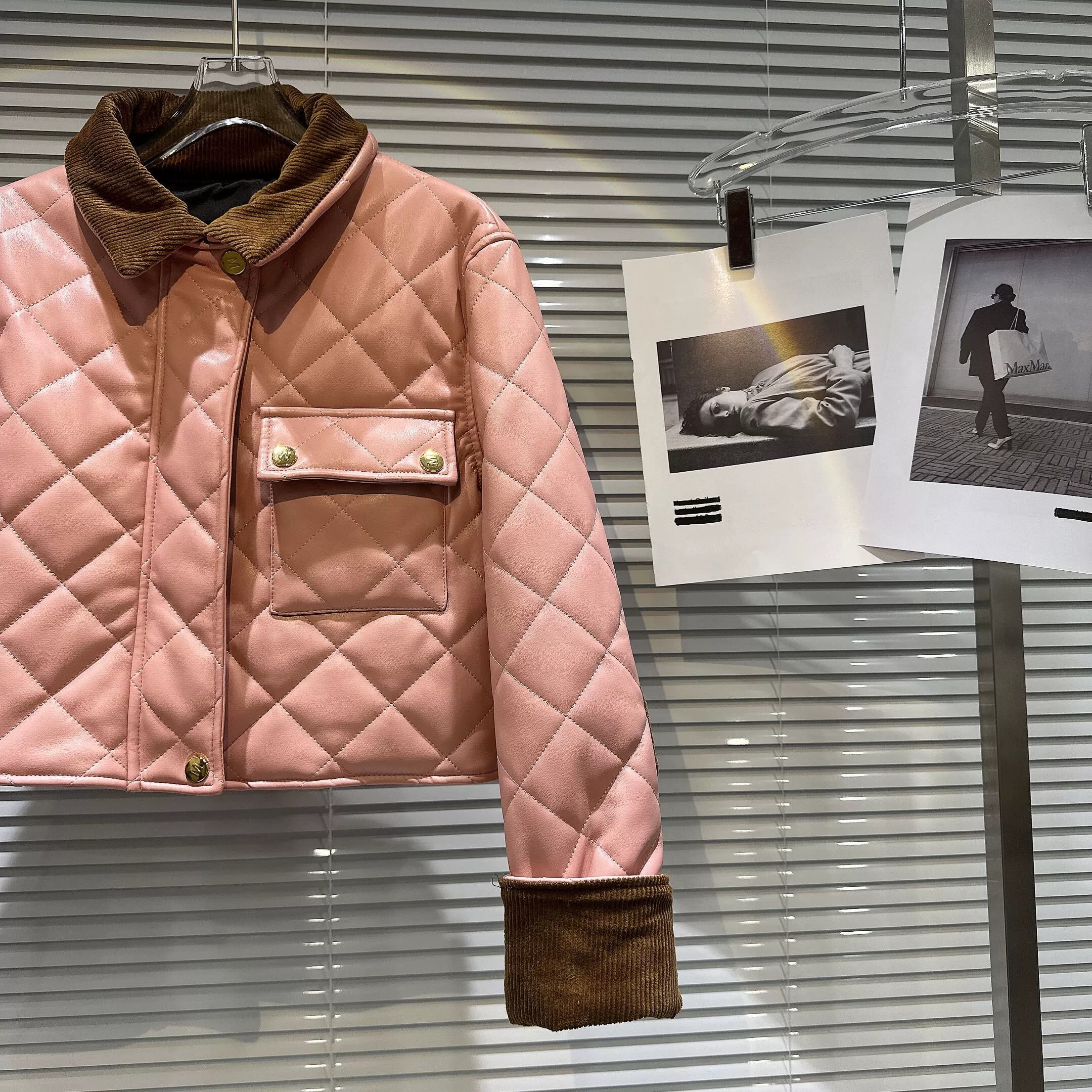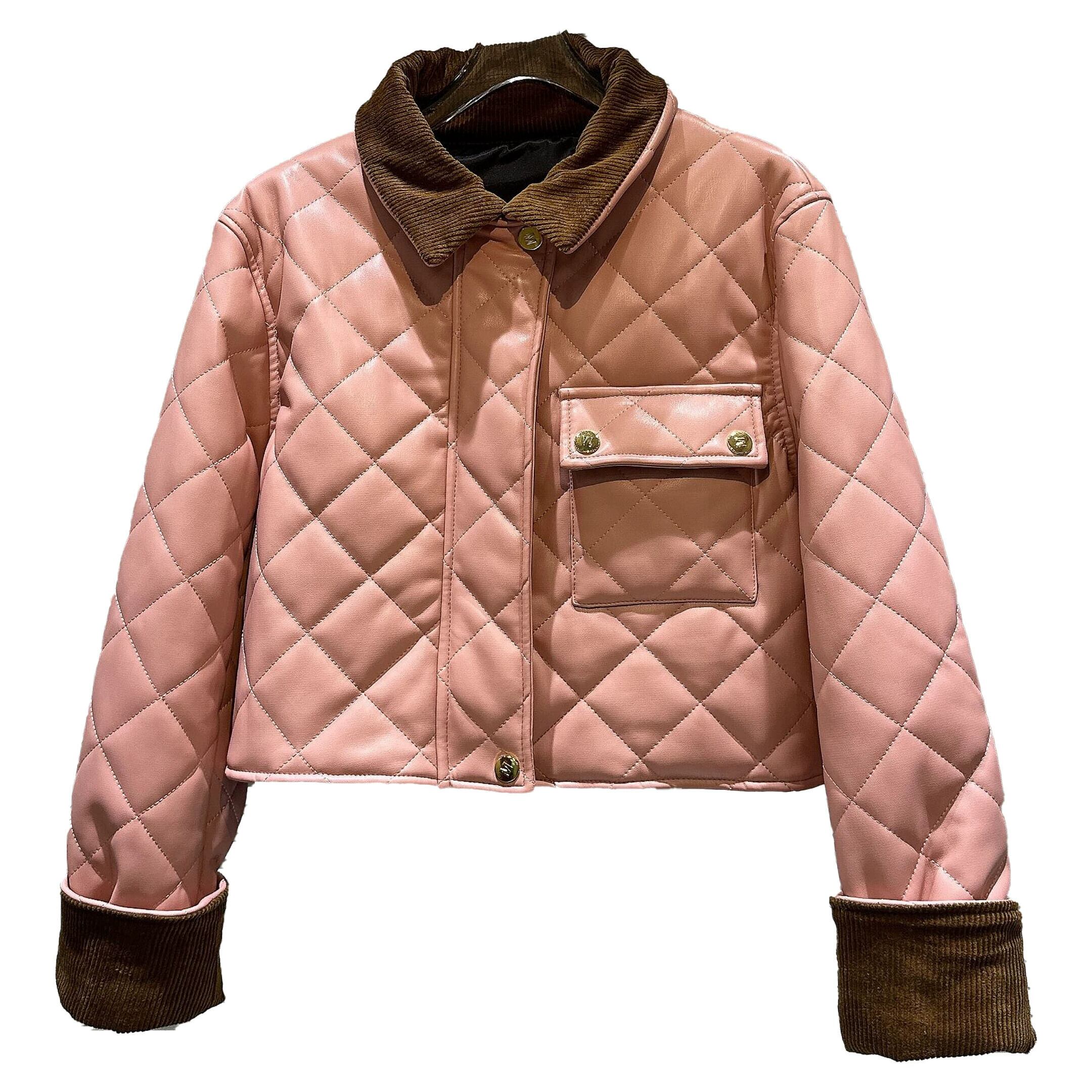 インターネット有名人同じスタイル 2024 春の新スタイル小さな香りコーデュロイ襟菱形チェック柄プレス綿暖かい PU レザーコットンコート女性 スプリング 春物 gyan332029056392 | vestitialla