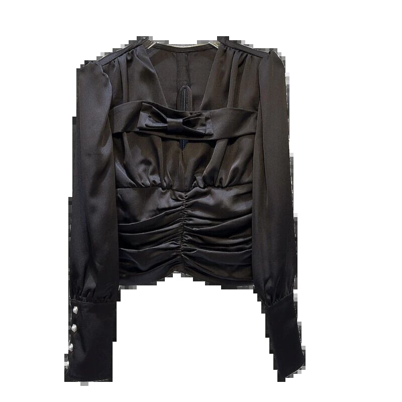 インターネットセレブの同じスタイル2024春の新しいスタイル小さな香りの女性蝶ネクタイピンサテンプリーツVネックシャツシャツ リボン スプリング 春物 gyan334280122686 | vestitialla