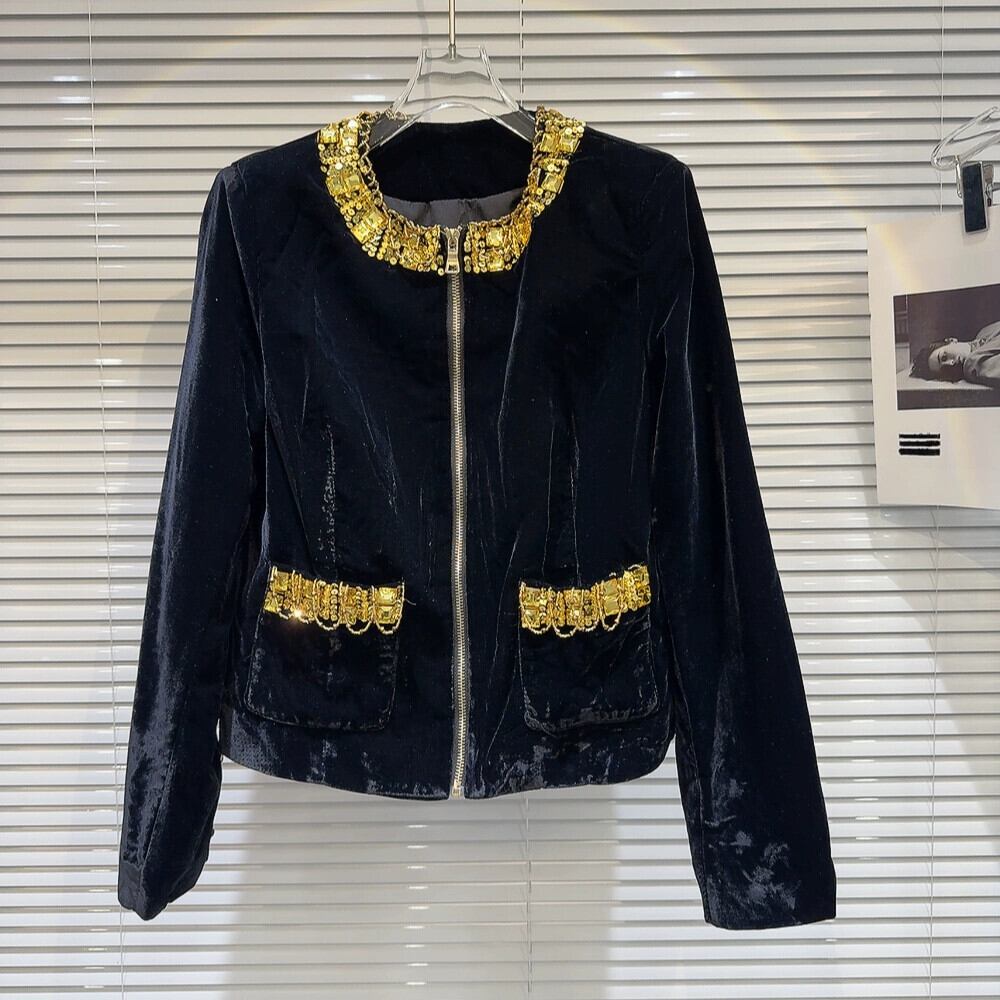 インターネット有名人同様2024春の新しい気質社交家重工業ゴールドダイヤモンドチェーンショルダーパッドベルベットジッパーショートジャケット スプリング 春物 gyan3373552426239 | vestitialla