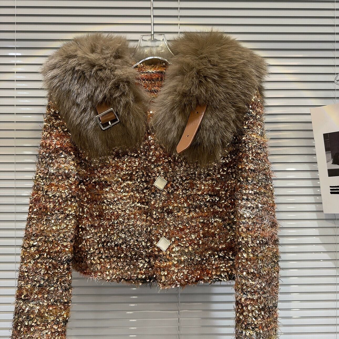 インターネットセレブの同じスタイル 2024 冬の新しいニッチセレブ高精細キツネの毛皮の襟スパンコール重工業キルティングショートコート女性 ウィンター 冬物 gyan337223973063 | vestitialla