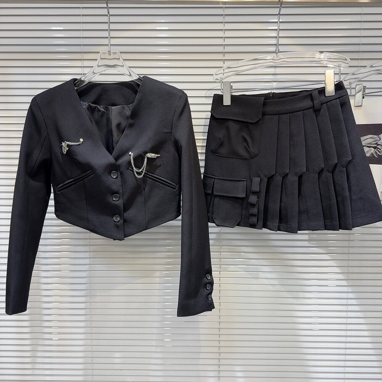 インターネットセレブと同じスタイル 2024 春の新しいカレッジスタイルのチェーンピン V ネックブレザー + プリーツスカートスーツの女性 スプリング 春物 Vネック gyan3353437002233 | vestitialla