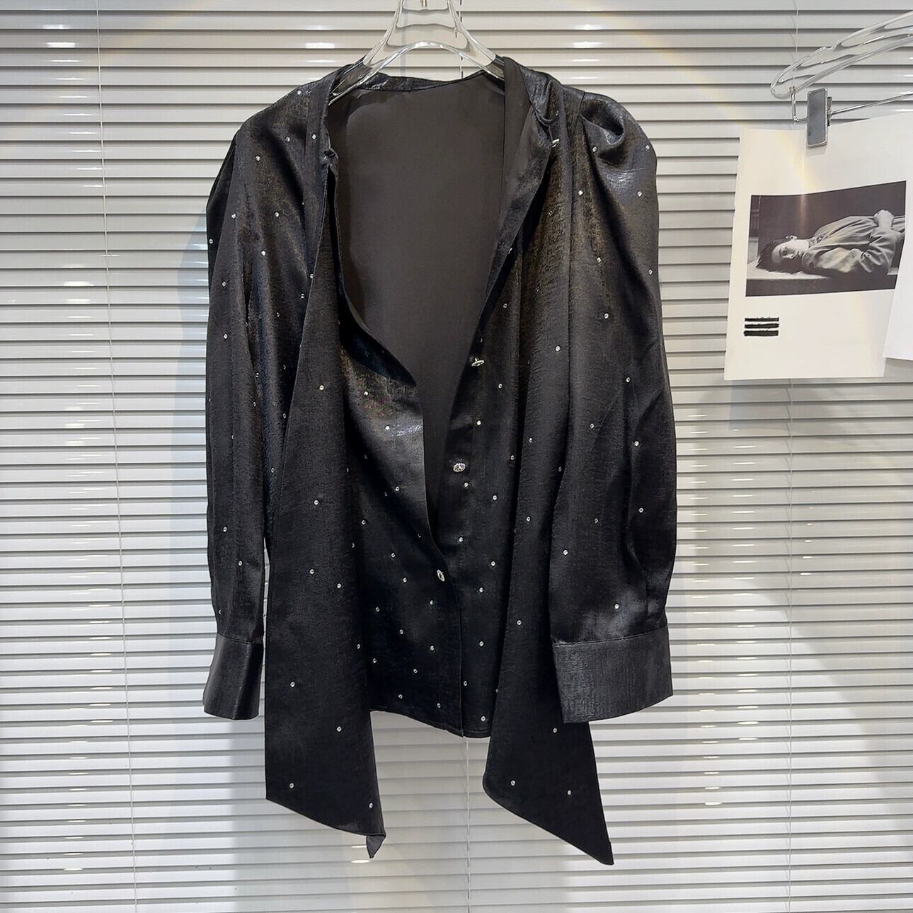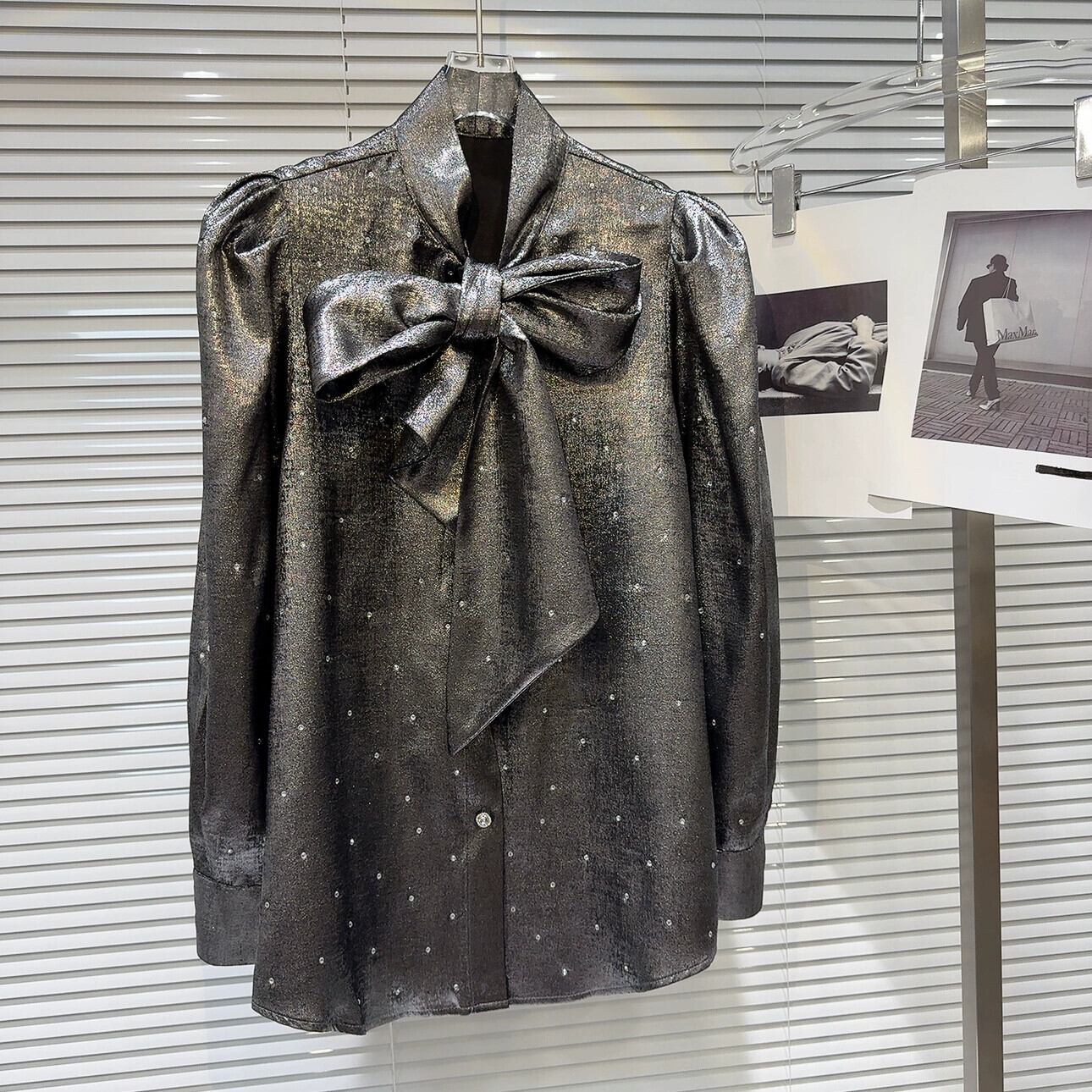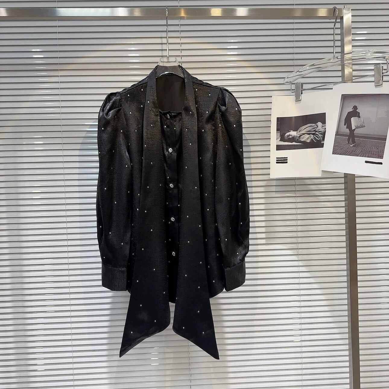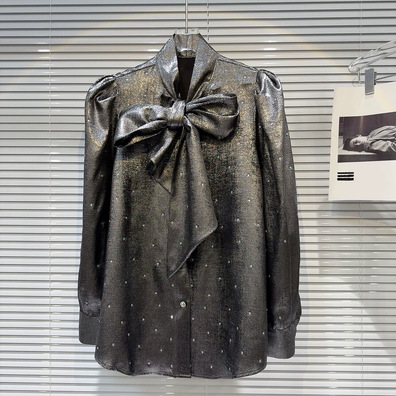 インターネットセレブと同じスタイル 2024 春の新スタイル小さな香りのよいダイヤモンドストラップ弓パフスリーブシルケットシャツ女性 リボン スプリング 春物 gyan3372792031696 | vestitialla