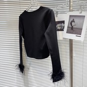 インターネットセレブと同じスタイル 2024 春の新ニッチセレブダチョウの羽カフプレートボタン襟無地長袖 Tシャツ女性 ロング スプリング 春物 ソリッドカラー gyan3313479125928 | vestitialla