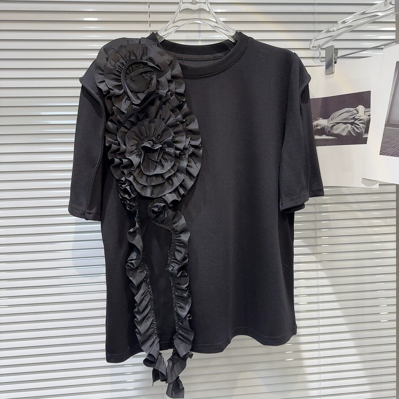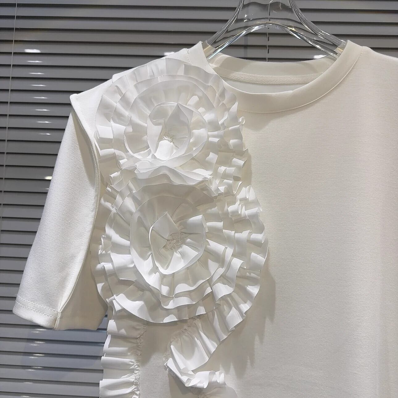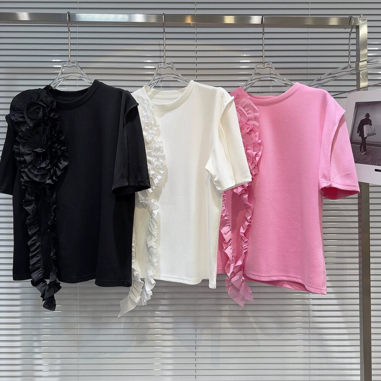 ネットセレブと同じスタイル 2024 夏の新スタイル小さな香りフリルプリーツ立体花無地半袖 Tシャツ女性 サマー 夏物 ソリッドカラー フラワーデザイン gyan3326037963149 | vestitialla
