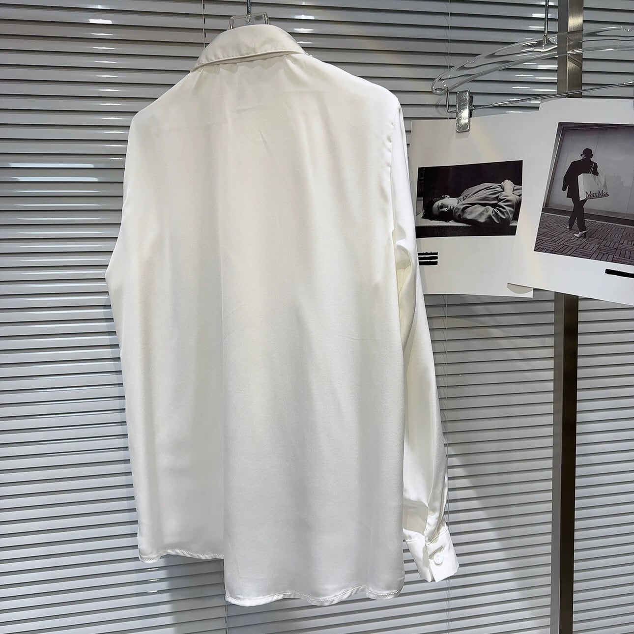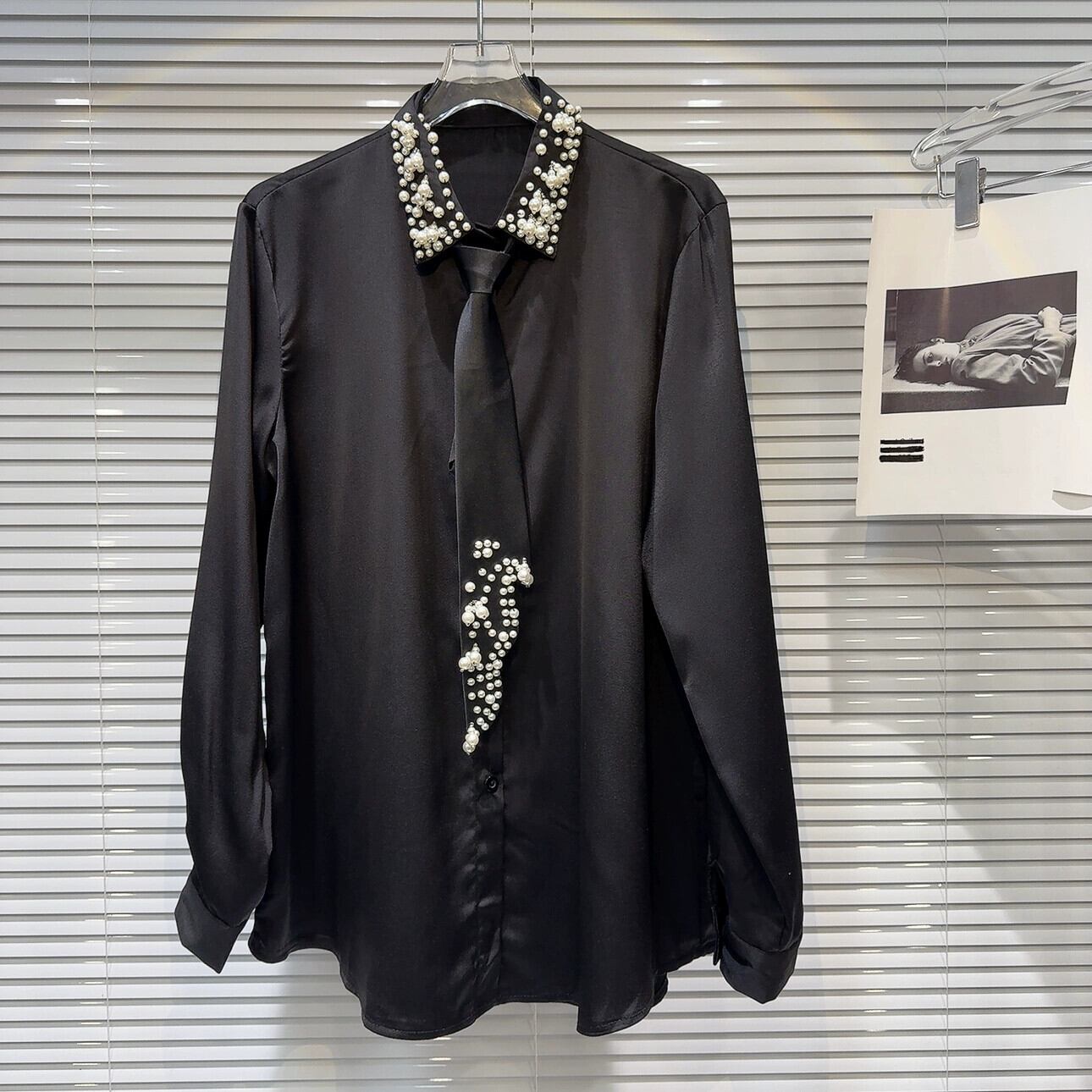 インターネットセレブと同じスタイル 2024 春の新作ダークブラックセレブ重工業パールビーズネクタイサテン無地シャツシャツ スプリング 春物 真珠 ソリッドカラー gyan3359981147364 | vestitialla