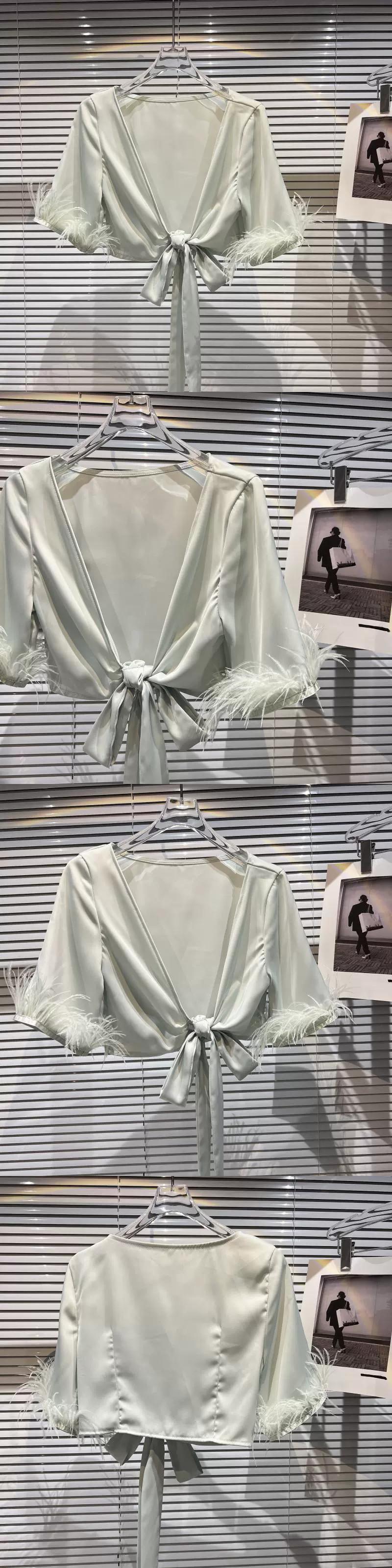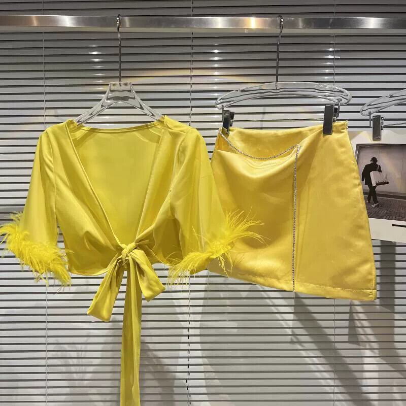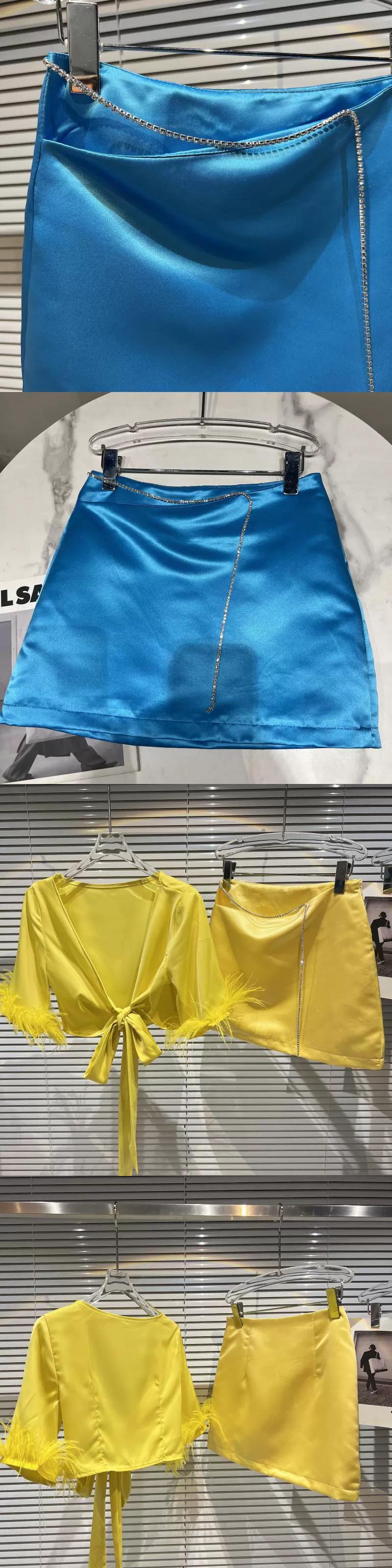 インターネット有名人の同じスタイル 2024 新しい夏スタイル少し香りの良い女性の毛皮のような袖シルクネクタイシャツラインストーンチェーンスカートスーツ サマー 夏物 gyan3337845544005 | vestitialla