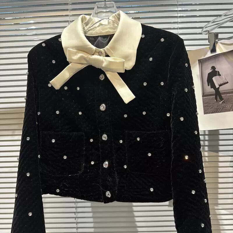 インターネットセレブと同じスタイル2024春の新スタイル小さな香りのスタイル粒子ラインストーンシルクリボン襟ベルベットトップショートジャケット スプリング 春物 gyan3393986210298 | vestitialla