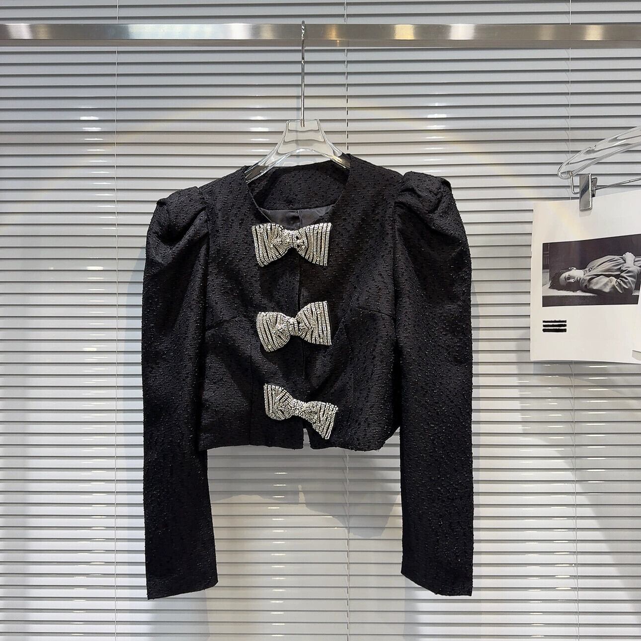 インターネット有名人の同じスタイル2024春の新しいスタイルの小さな香りのよいラインストーンのリボンが装飾されたゴールドパフスリーブショートジャケットトップ スプリング 春物 gyan3342265915194 | vestitialla