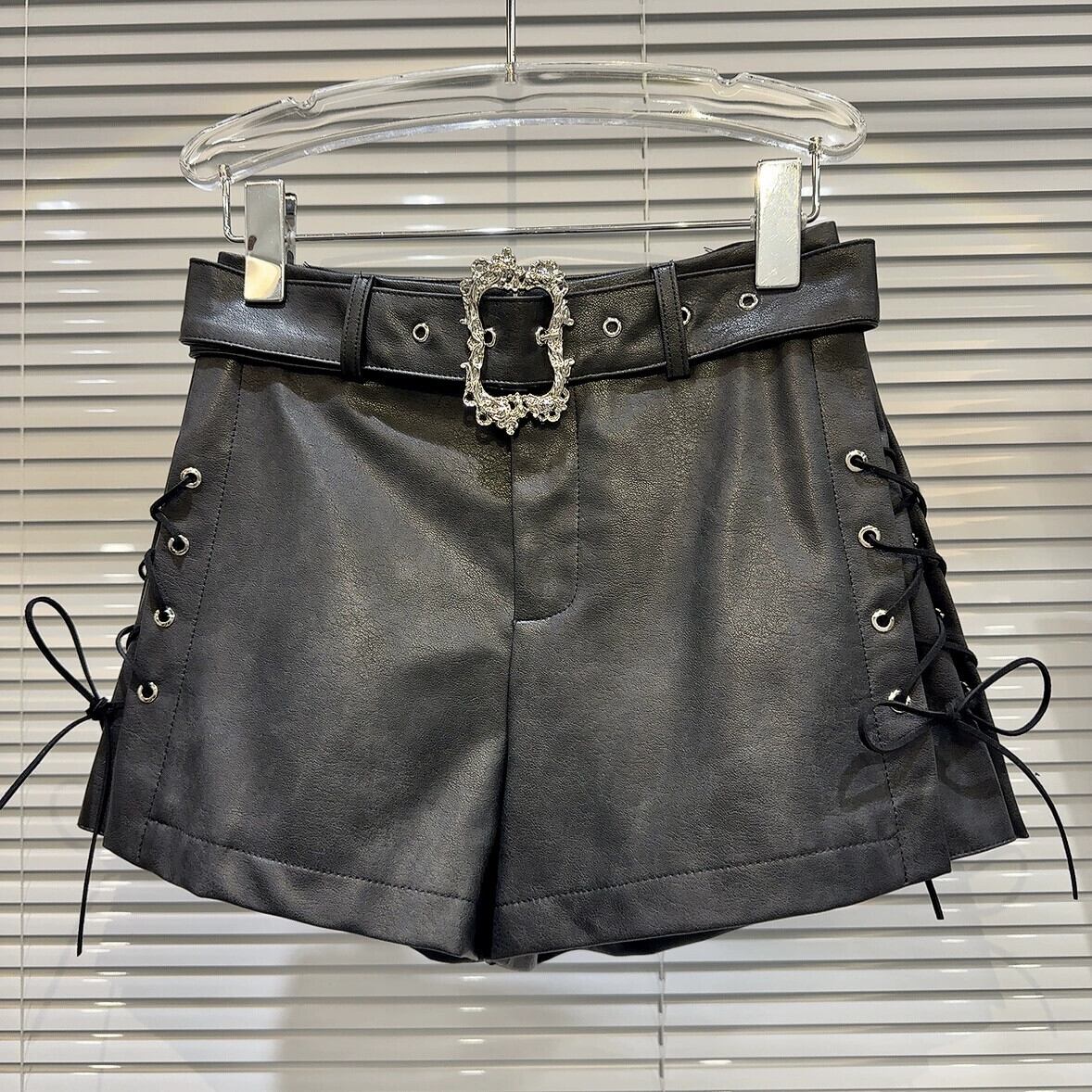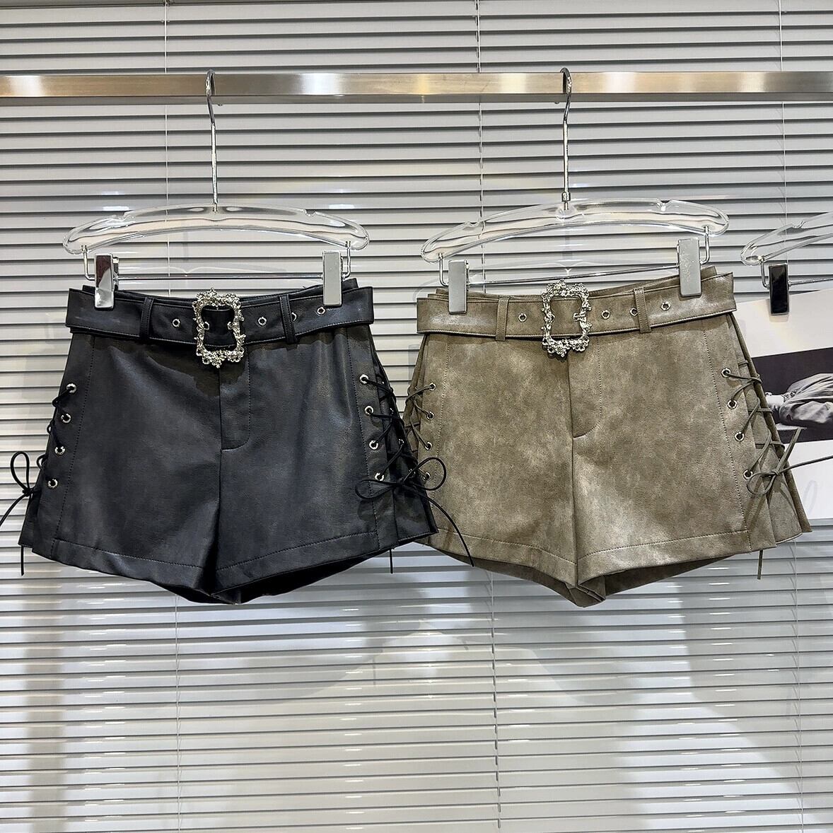 インターネットセレブと同じスタイル 2024 春の新オートバイネクタイサイドストラップデザイン絞り染めテクスチャードレザーショーツレザーパンツ女性 レッド スプリング 春物 ブルマー gyan3317734238775 | vestitialla