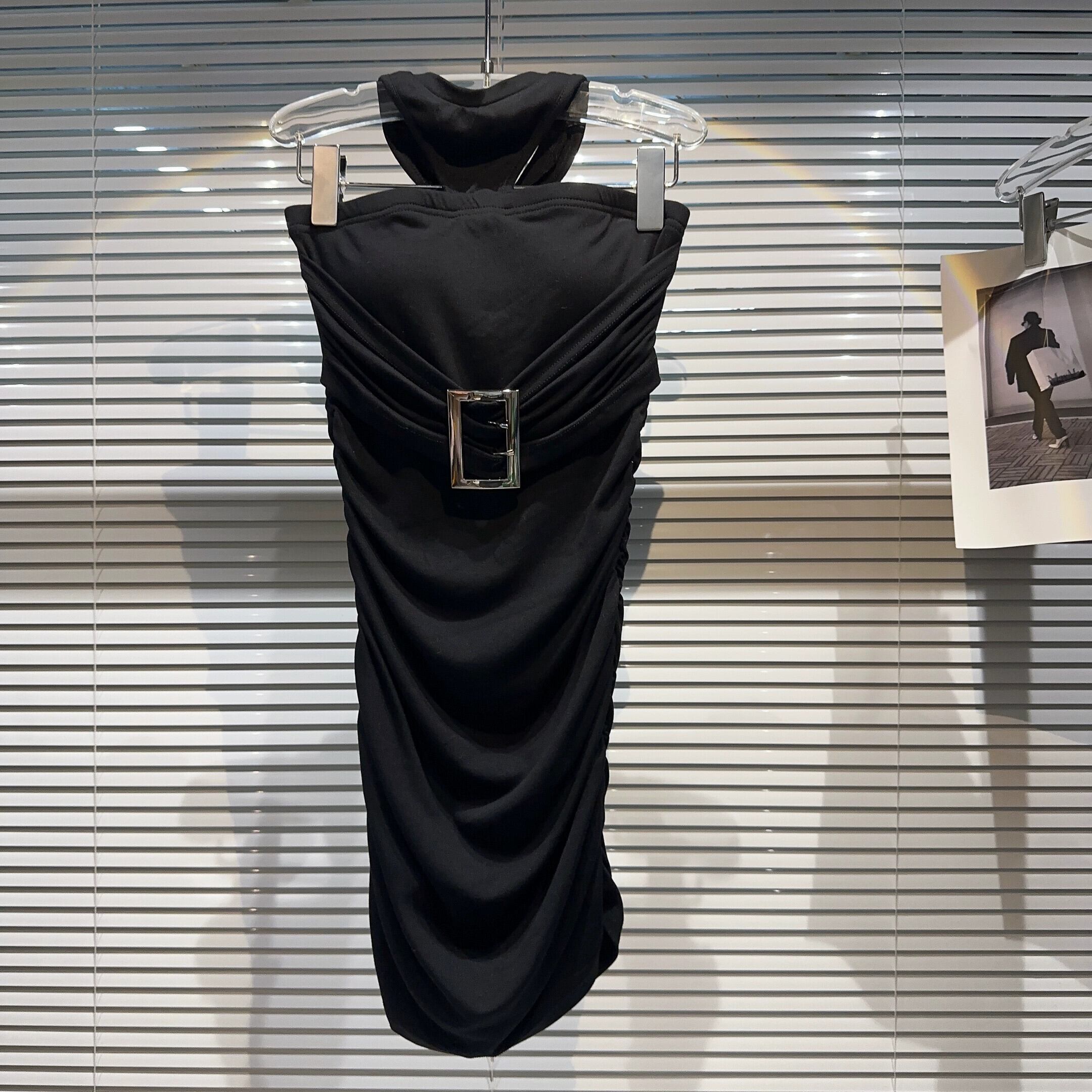 インターネットセレブと同じスタイル 2024 夏の新しいラウンドネックメタルバックル装飾タイトセクシーなホルターネックショートドレス女性 サマー 夏物 Oネック gyan336594066523 | vestitialla