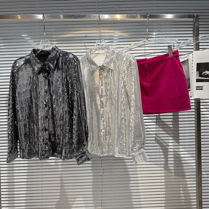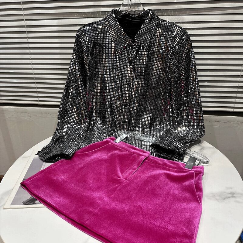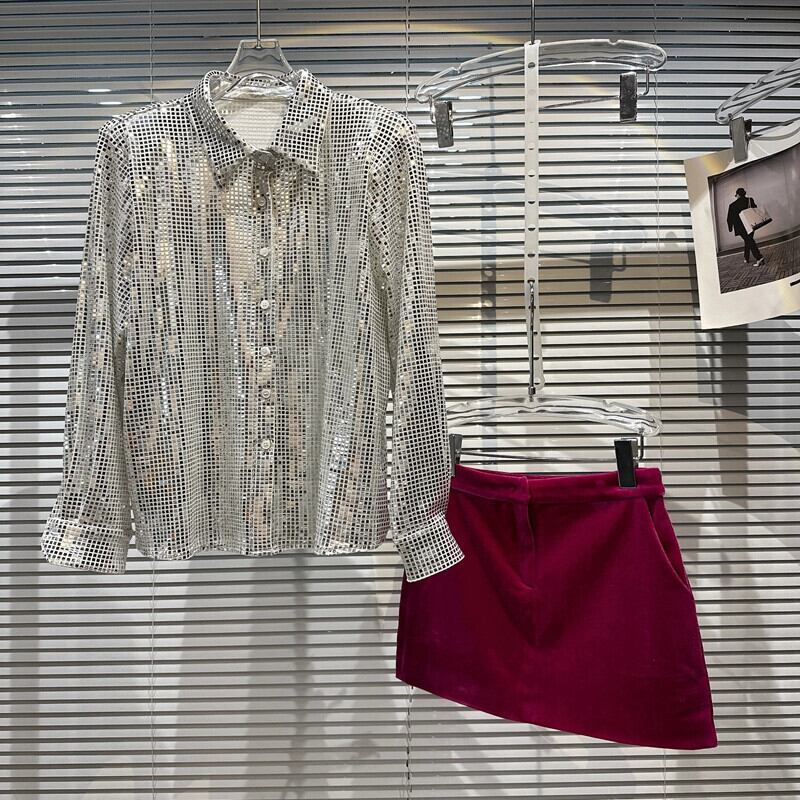 インターネットセレブの同じスタイル2024春の新しいニッチスタイルスクエアスパンコールシャツ+ローズレッドベルベットスカートスーツシングルS スプリング 春物 スクウェア gyan3321056724321 | vestitialla