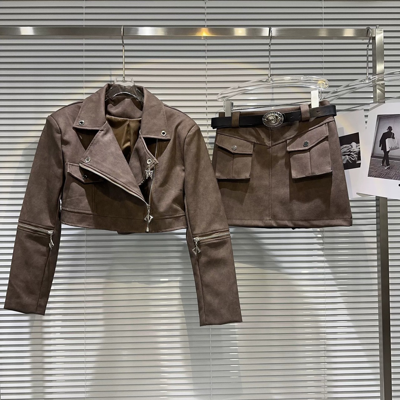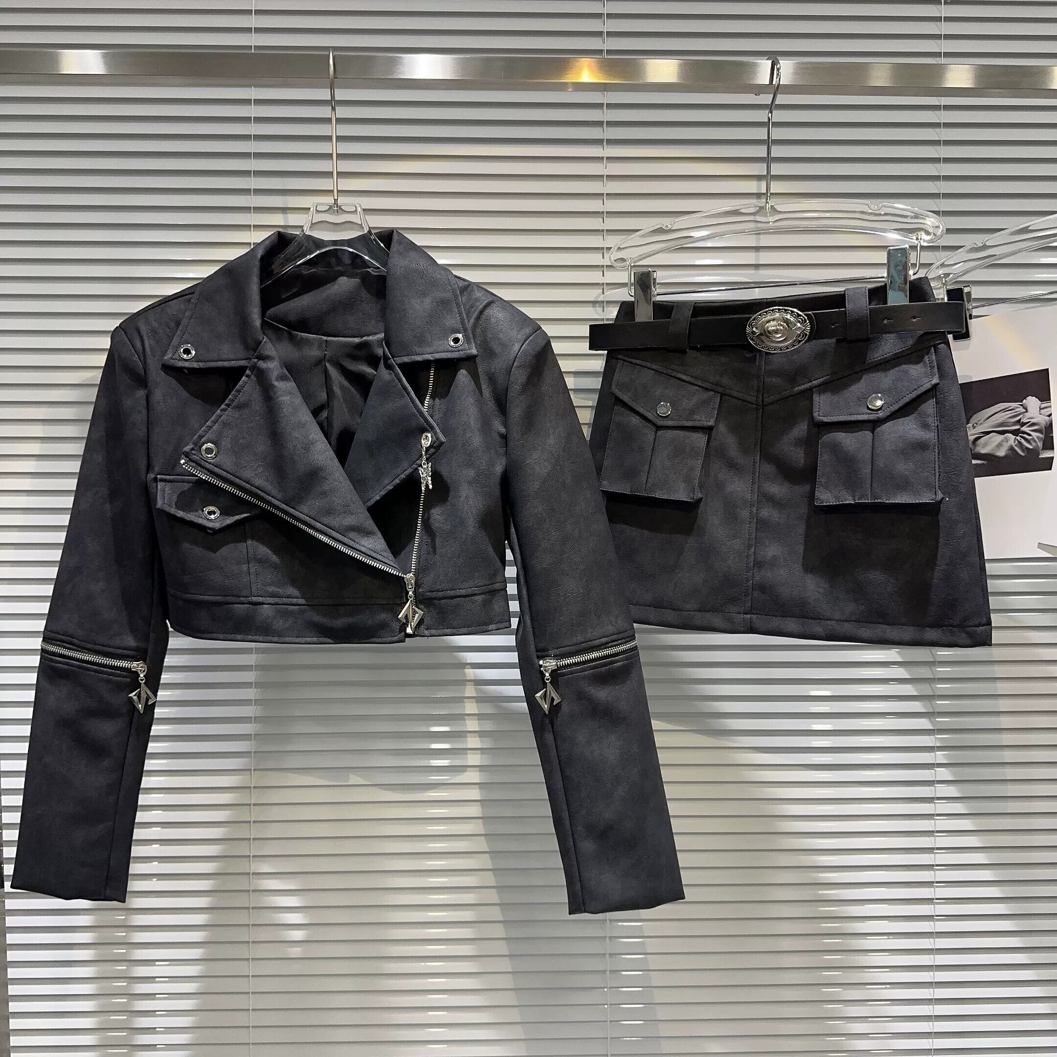 インターネット有名人の同じスタイル2024春の新しいオートバイのジッパースリーブつや消しレザージャケット+ワークスカートスーツトレンディ スプリング 春物 gyan3368411173826 | vestitialla