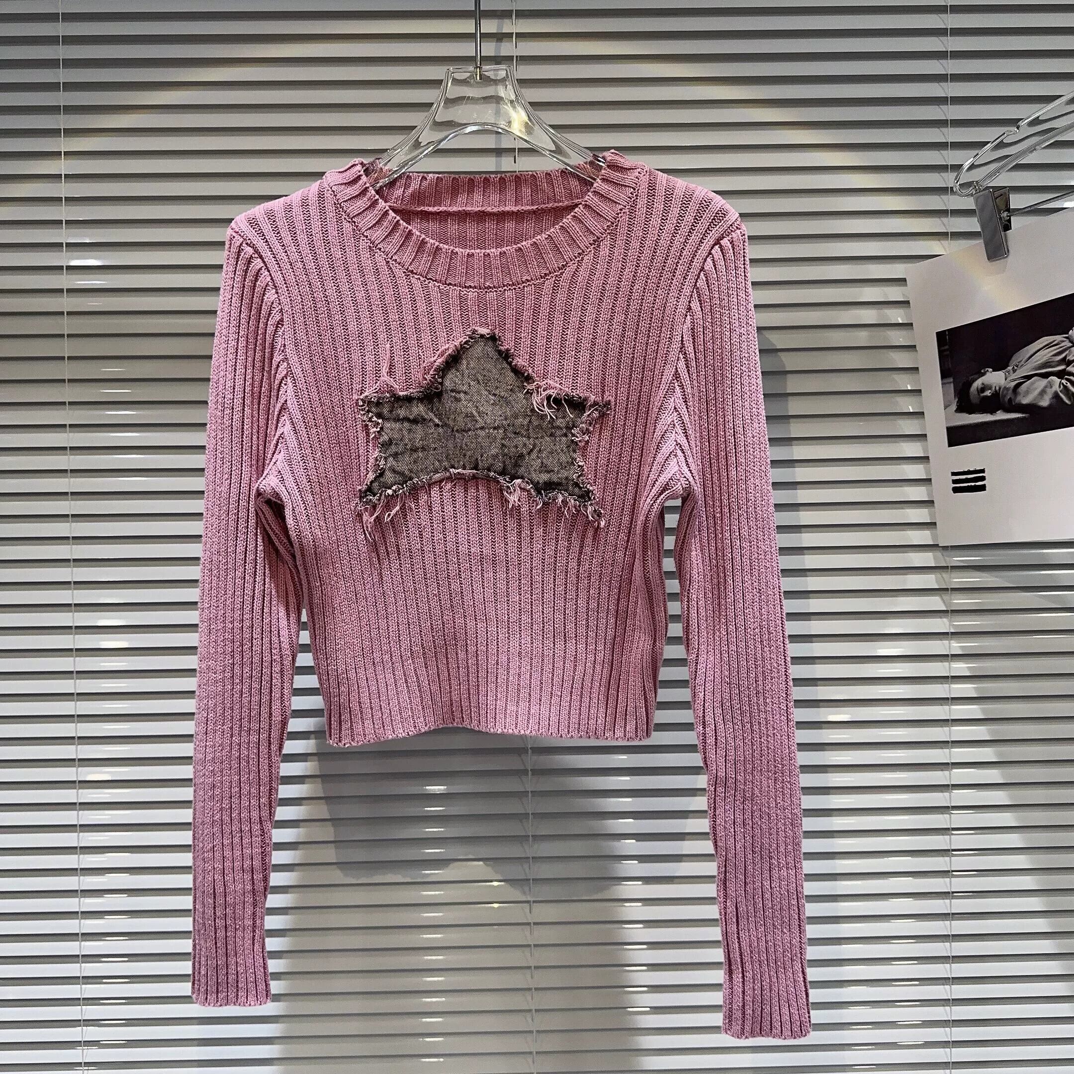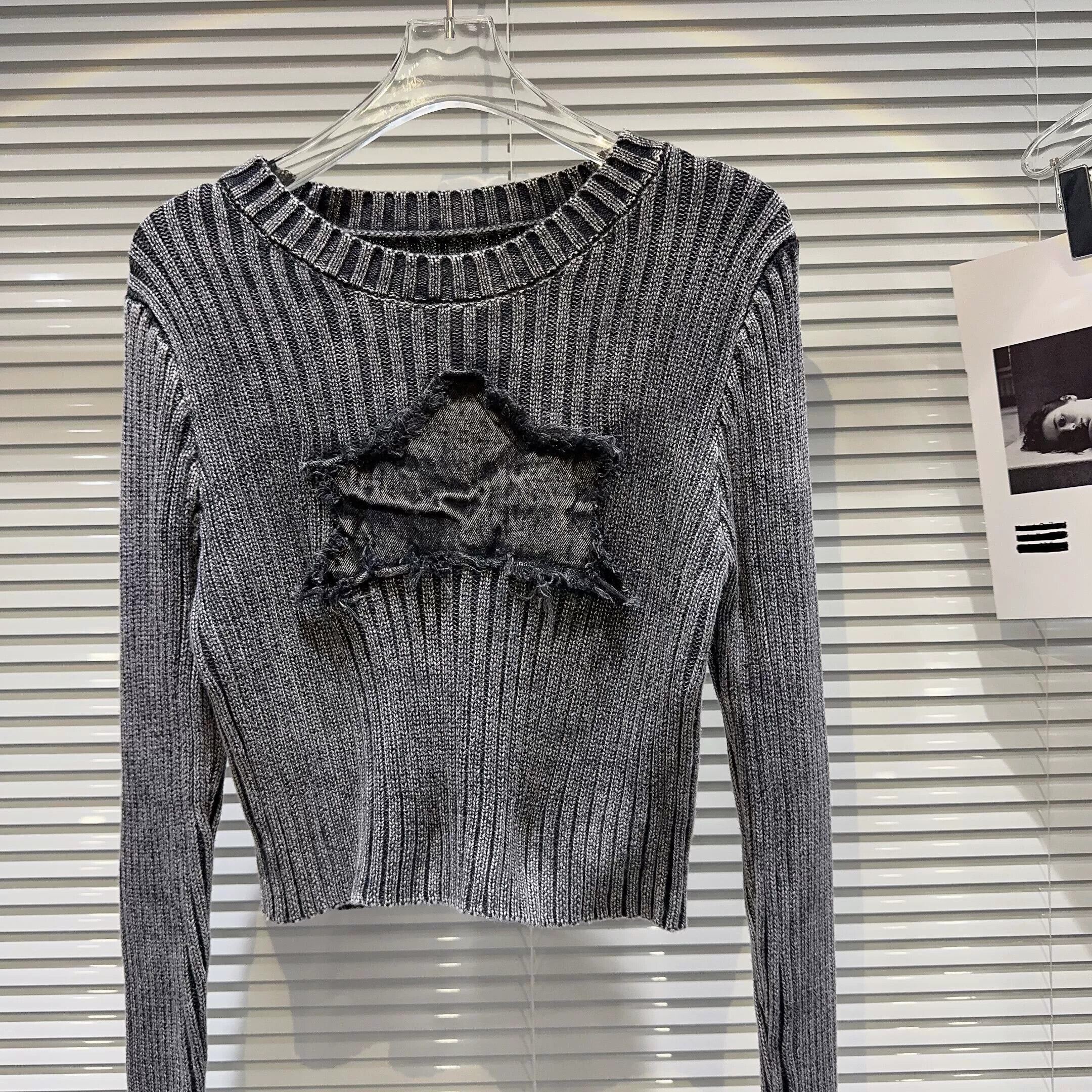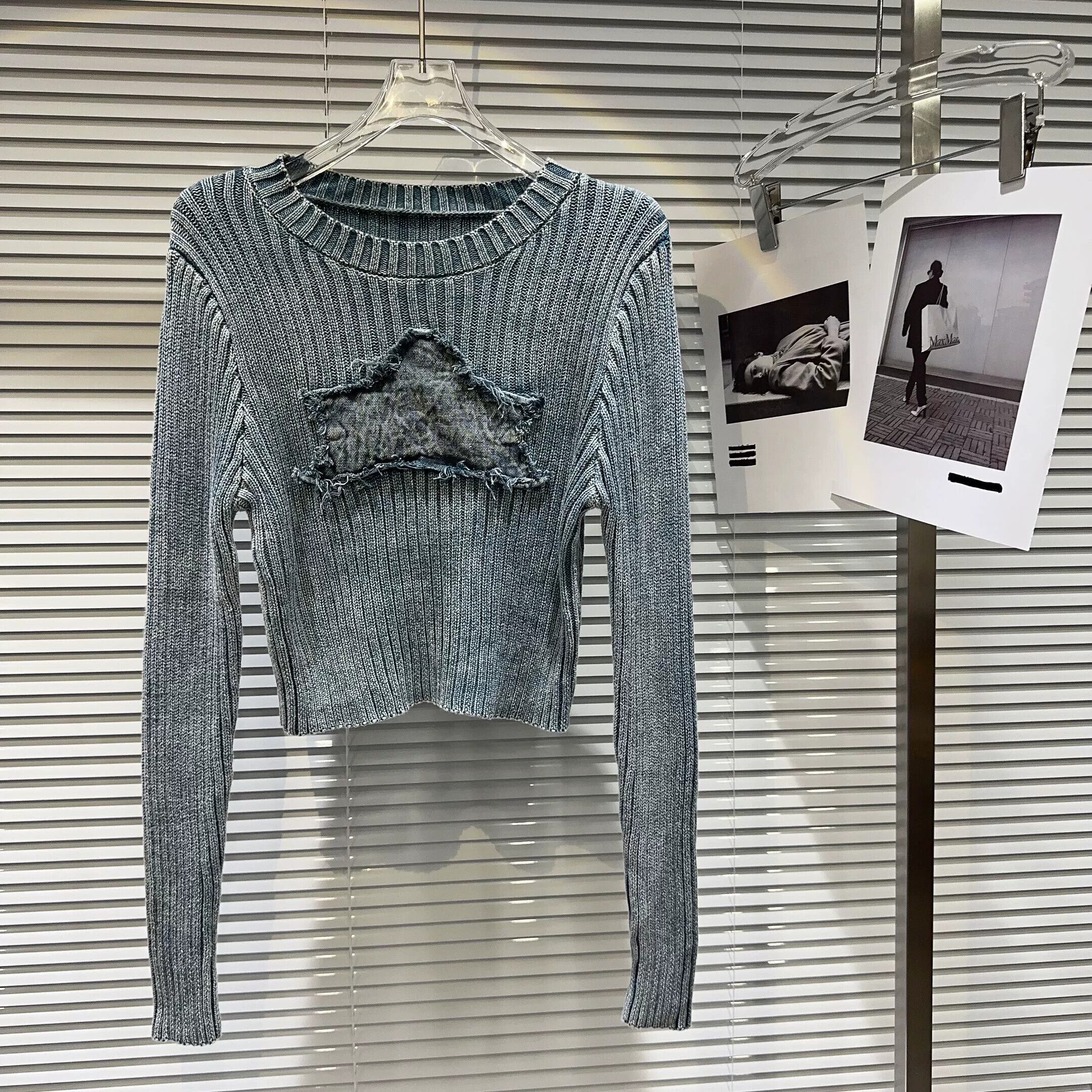 インターネットセレブと同じスタイル 2024 新しい秋デニム五芒星柄ウォッシュウォッシュホワイトコットンニットシャツ女性 オータム 秋物 gyan3317796598730 | vestitialla