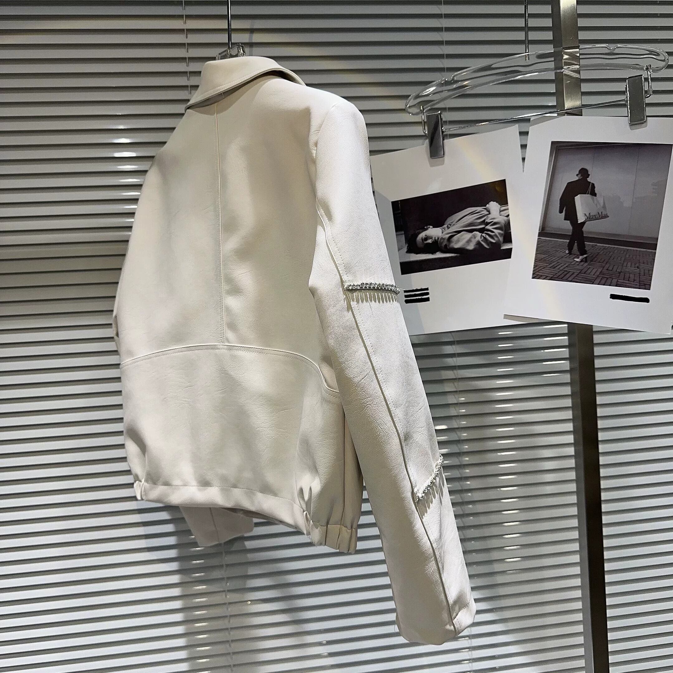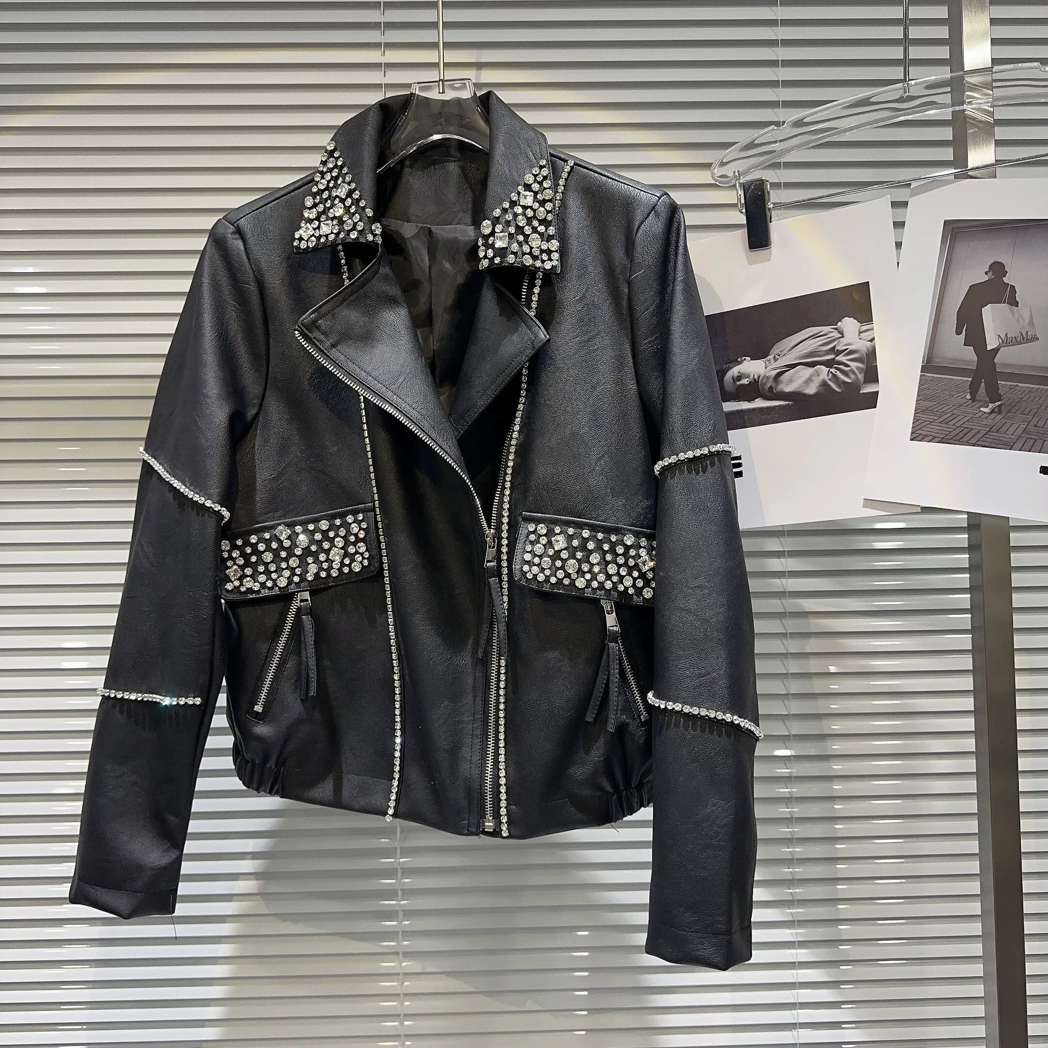 ネット有名人の同じスタイル 2024 新しい秋ストリートスタイルラインストーンビーズデザイン重工業バイクウォッシュレザージャケット女性 オータム 秋物 gyan3350953192697 | vestitialla