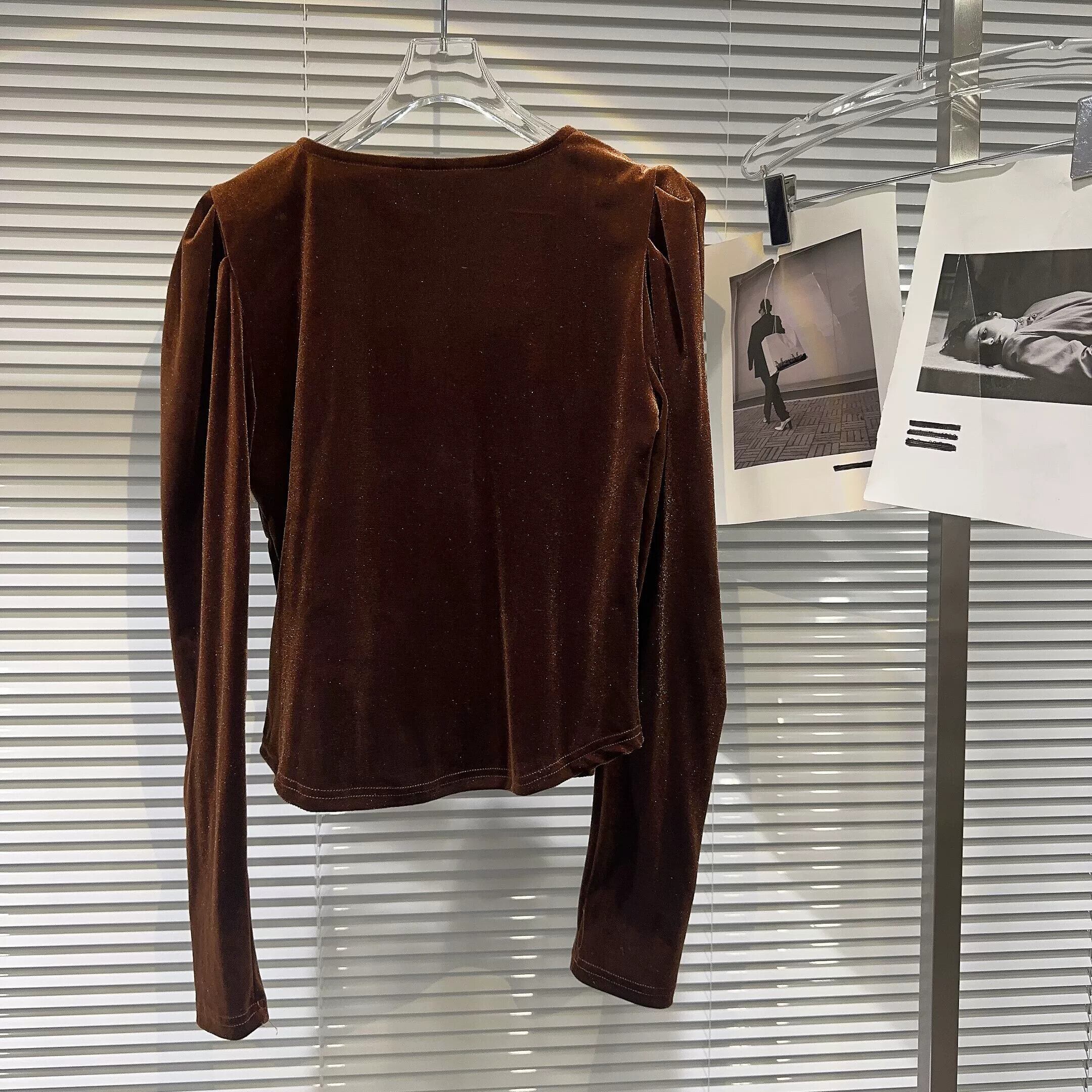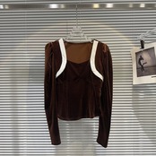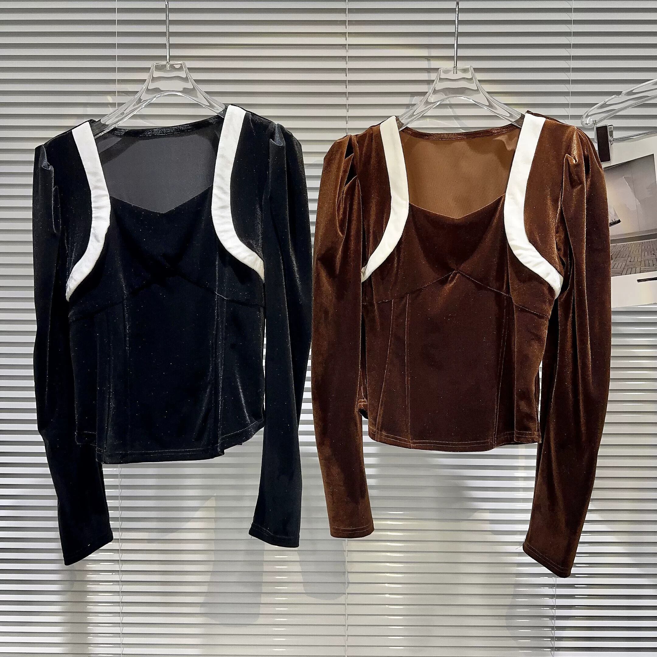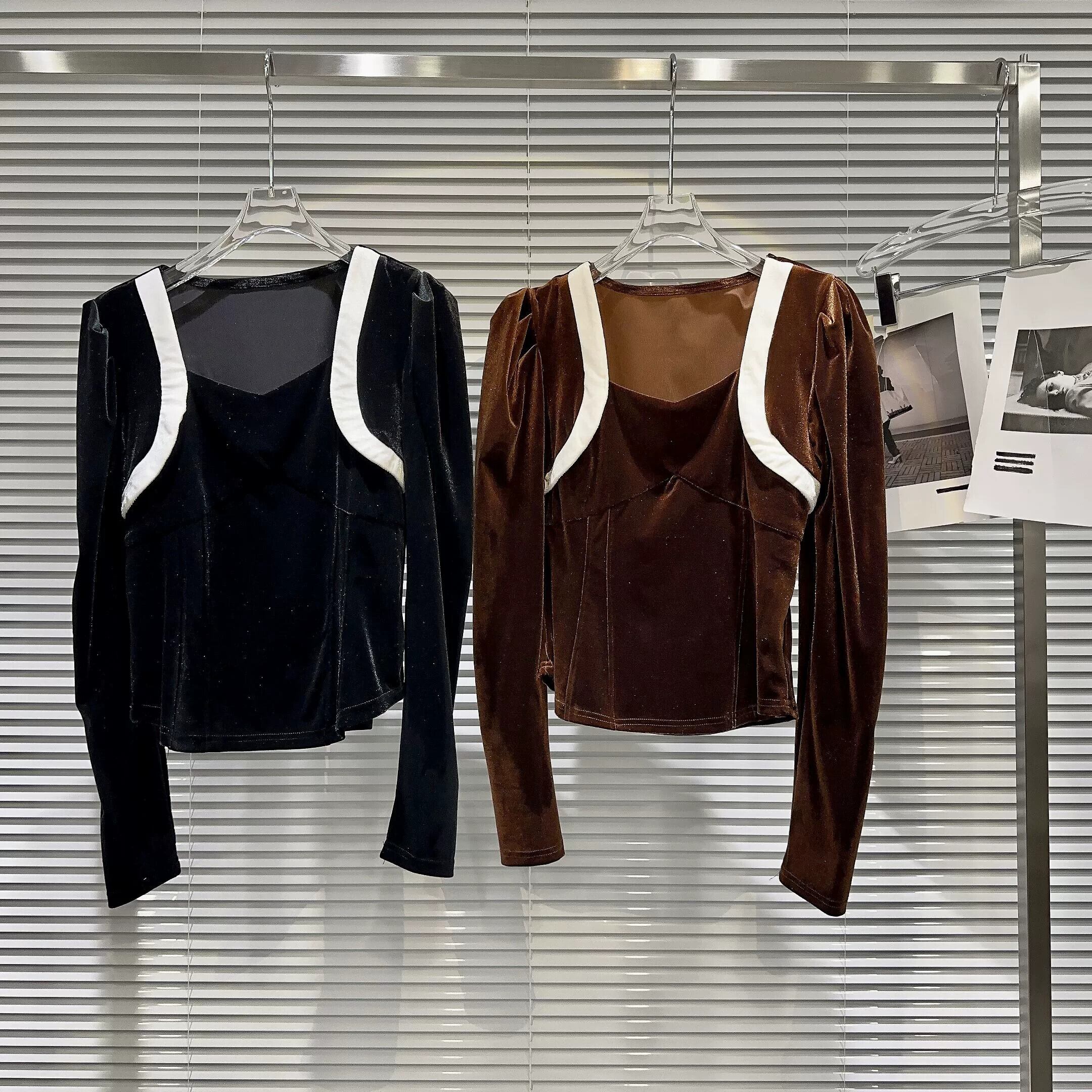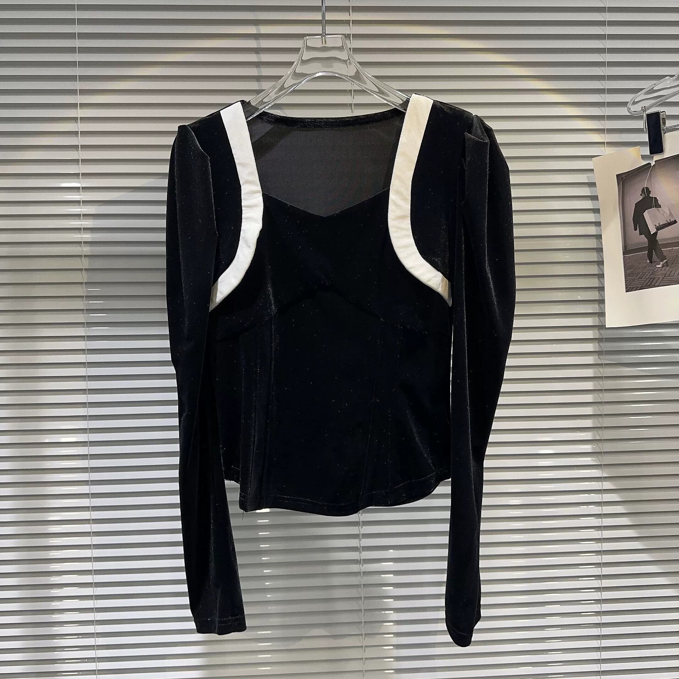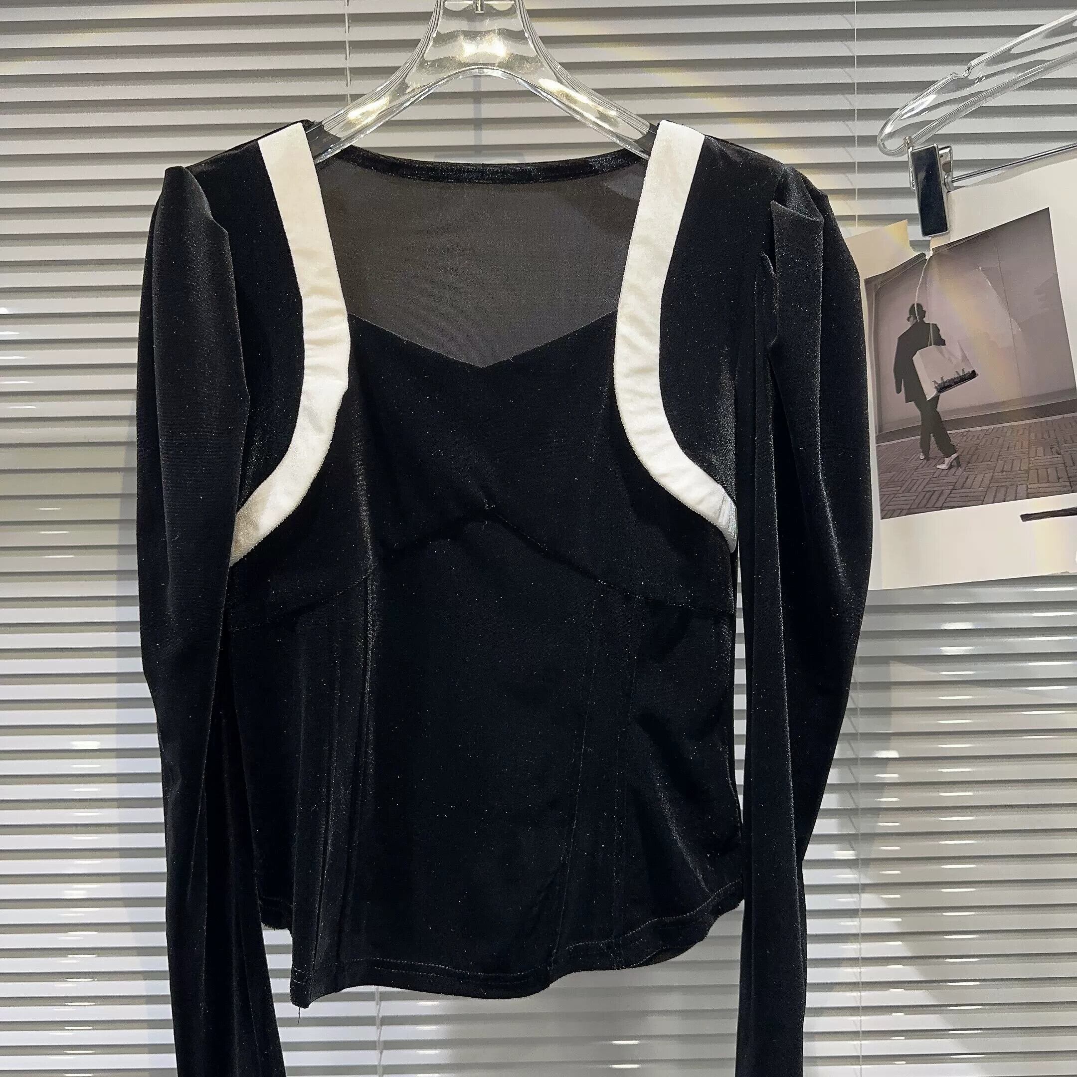 インターネットセレブと同じスタイル20241春の新しいニッチスタイルスクエアカラーホワイトステッチコントラストベルベット長袖Tシャツ小さなシャツ ロング スプリング 春物 スクウェア gyan3318786364089 | vestitialla