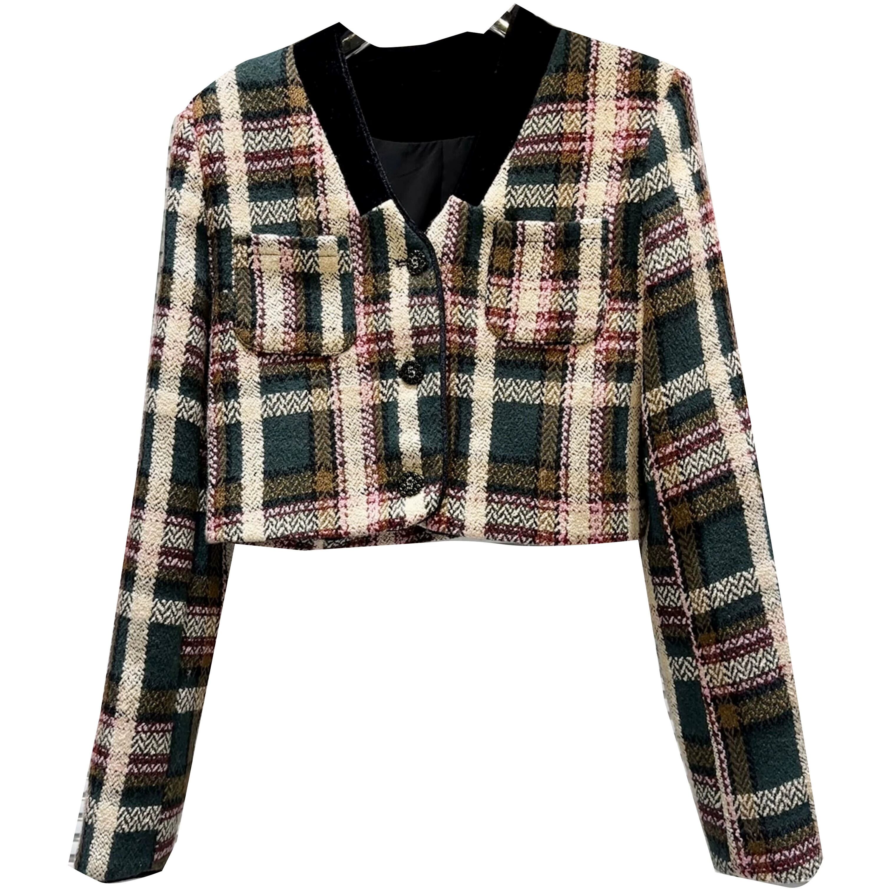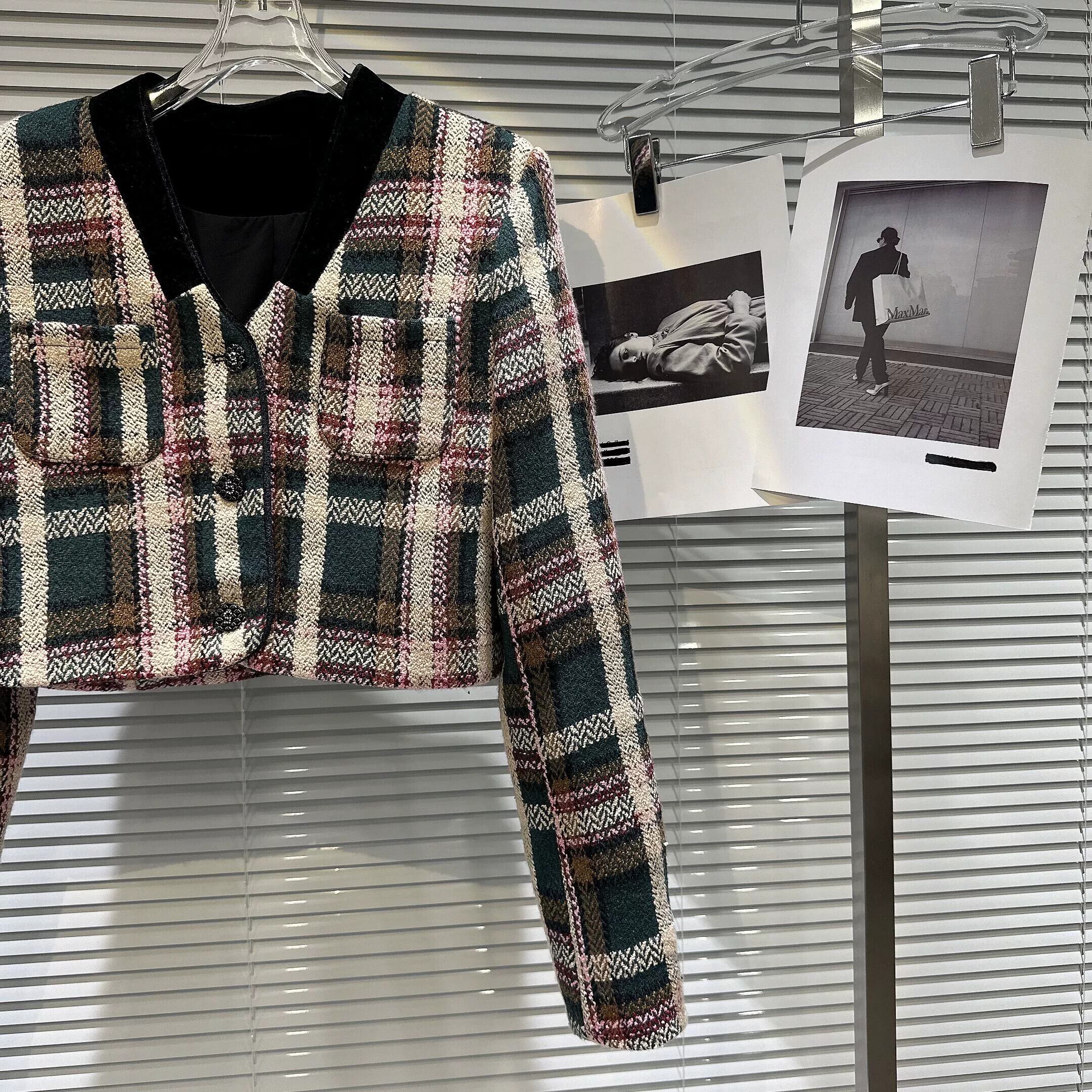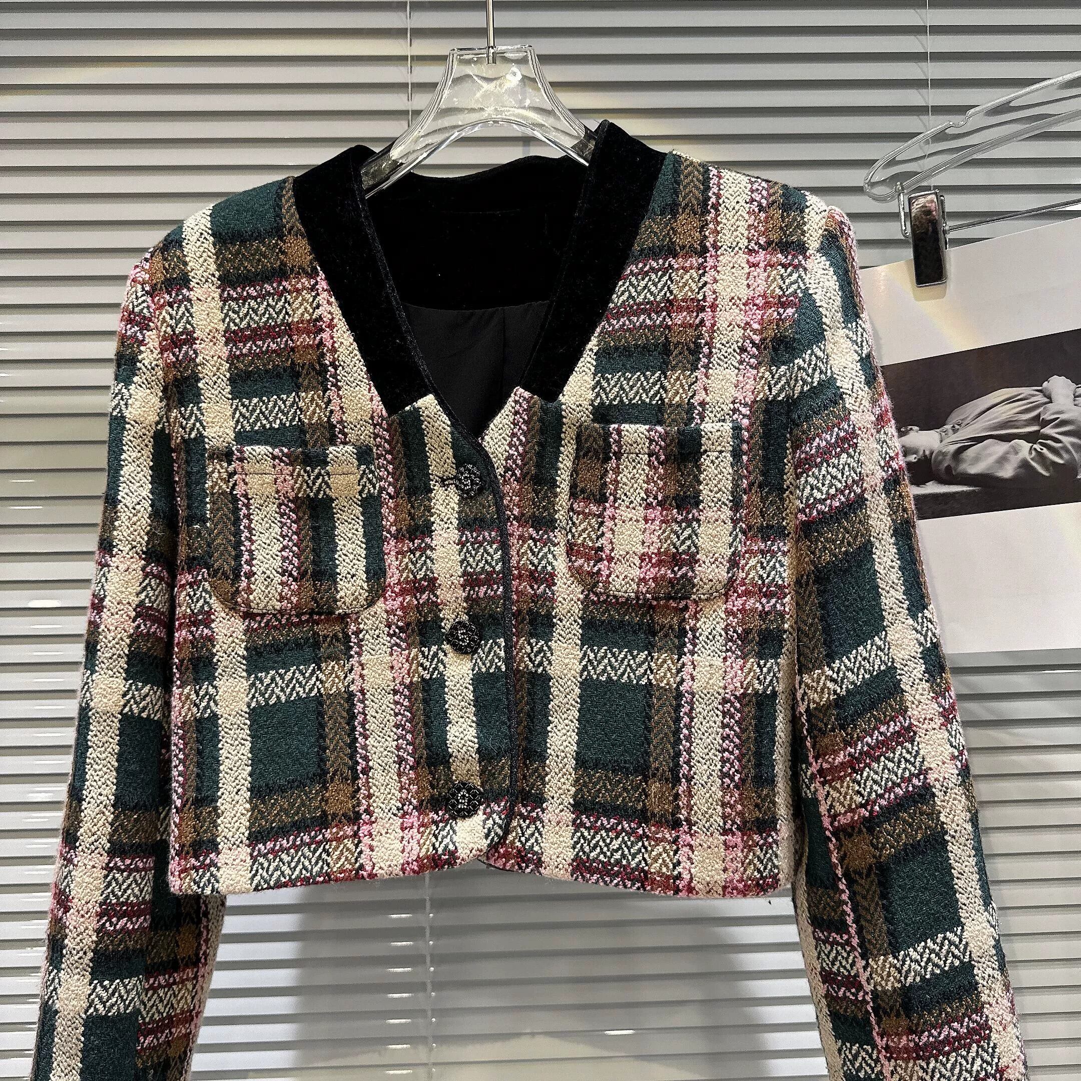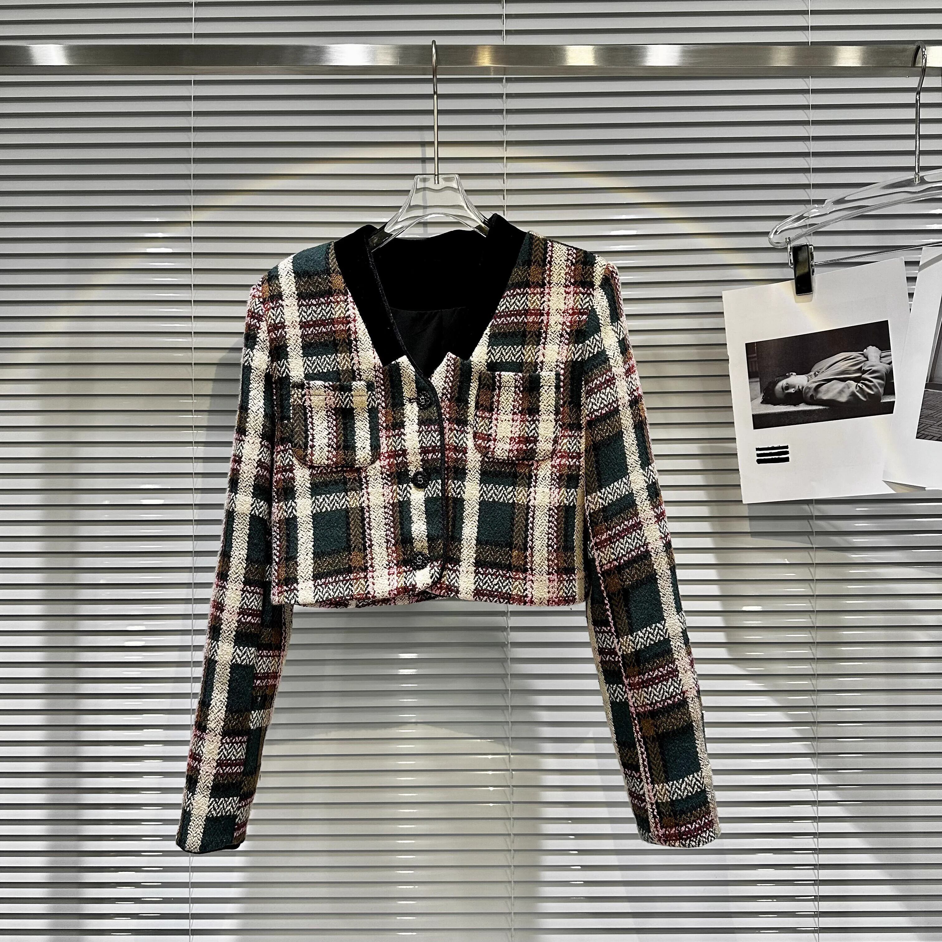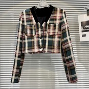 ネット有名人の同じスタイル 2024 春の新スタイル小さな香りのスタイルカラフルなストライプのチェック柄ベルベット V ネックショルダーパッドレディースショートコート女性 スプリング 春物 Vネック gyan3381417541984 | vestitialla