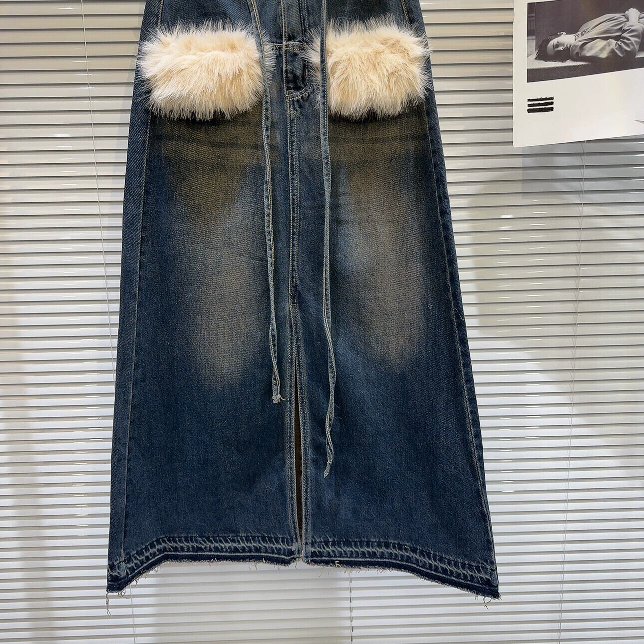 インターネット有名人の同じスタイル2024冬の新しいニッチスタイル毛皮のようなポケット巾着ベルトデニムスカートミドル丈スカートスカート ウィンター 冬物 ハーネス gyan3319868923579 | vestitialla